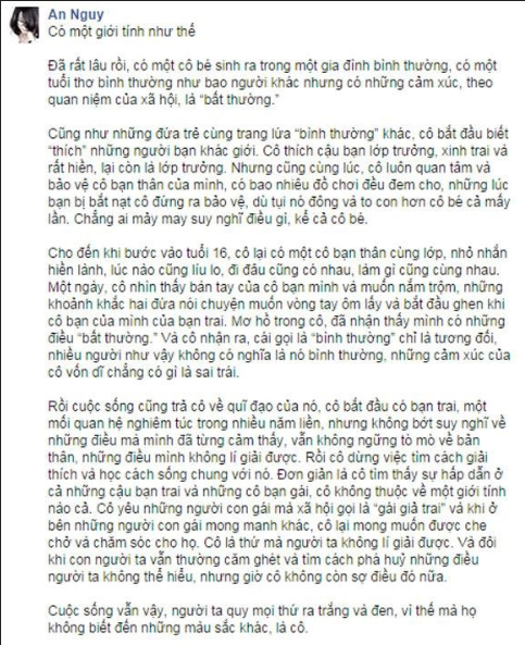 Đỉnh điểm là vào tháng 9/2014, An Nguỵ bất ngờ đăng tải những dòng tâm sự, lần đầu chia sẻ về xu hướng tính dục của bản thân công khai trên tài khoản Facebook cá nhân. Cô không dán nhãn bản thân mình, chỉ đơn giản là thích cả hai giới, “cô không thuộc về một giới tính nào cả.” Chưa dừng lại ở đó, không lâu sau, tài khoản Facebook cá nhân của Alex cũng thay đổi trạng thái quan hệ của mình và An Nguỵ thành “Married” (đã cưới).
