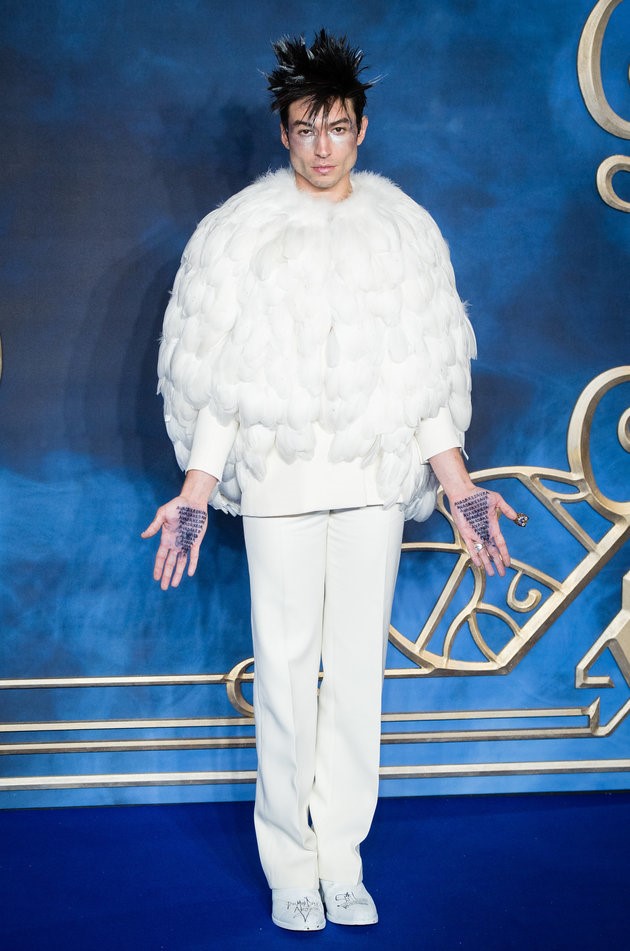 Được biết đến với vai diễn The Flash nổi tiếng của vũ trụ điện ảnh DC, Ezra Miller lần này trở lại với khán giả màn ảnh rộng thông qua vai diễn Credence Barebone của bộ phim “Sinh vật huyền bí phần 2”. Trên thảm đỏ ra mắt tại London, Ezra đã hóa thân thành chú cú Hedwig trong bộ trang phục lộng lẫy đến từ nhà thiết kế của Givenchy Haute Couture. Khuôn mặt anh cũng được trang điểm kĩ càng với điểm nhấn là phần mắt được đánh màu bạc và mái tóc tạo hình mũi nhọn. Tuy vậy, trong lòng bàn tay Ezra là câu chú chết chóc “Avada Kedavra” được in đậm và lặp lại nhiều lần. Điều đặc biệt là trang phục của Ezra không hề thiên về một đặc tính cụ thể nào hết. Chúng là sự pha trộn của nét táo bạo, chất dịu dàng và sắc sảo, hoàn toàn có thể tôn lên được vẻ đẹp và cá tính riêng biệt của Ezra.
