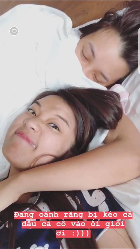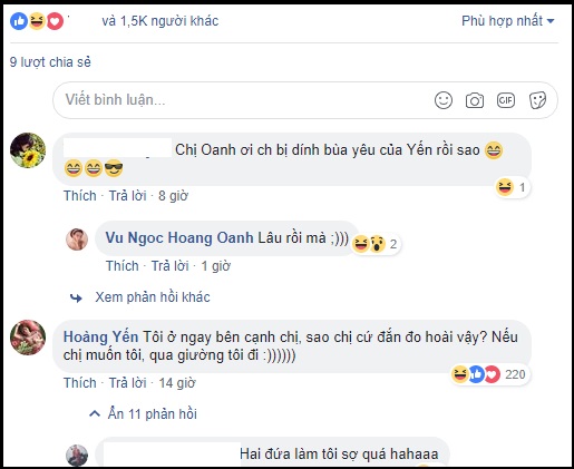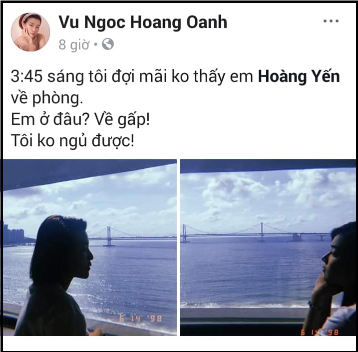 Kèm theo status là hai bức ảnh được chụp ở một địa điểm giống nhau của hai người. Ngay lập tức, Hoàng Yến đã comment: ”Tôi ở ngay bên cạnh chị, sao chị cứ đắn đo hoài vậy? Nếu chị muốn tôi, qua giường tôi đi!”