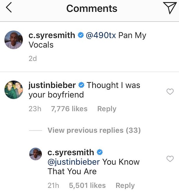 Smith đã đăng một video trên Instagram cùng tiêu đề: “Vocal của tôi, giọng hát của tôi”. Bieber đã vào xem và để lại bình luận: “Tôi tưởng đó là bạn trai của cậu”. Smith lập tức đáp trả: “Cậu biết đó chính là cậu đấy.”