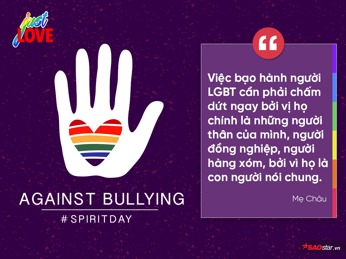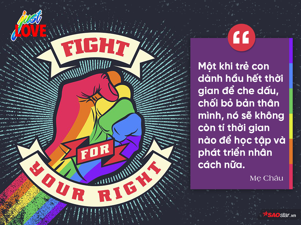 Ngoài ra, đối với mẹ Châu: “Người lớn nhất định phải bênh vực các bạn khi quyền lợi của các bạn bị xâm hại chứ không được thờ ơ trước cảm xúc của con em mình.” Khi người thân trong gia đình đang phải chịu bất kỳ một sự phân biệt đối xử, một sự kỳ thị, một sự bất công nào đó, hãy đứng lên vì họ thay vì buông những lời xót xa. Theo mẹ Châu, sống ở thời đại này, quyền con người phải luôn được đề cao. Một khi xã hội đã coi trọng quyền con người thì sẽ giảm thiểu được những câu chuyện đau thương đã và luôn tồn tại. Không ai có quyền can thiệp và thay đổi việc các bạn muốn bản thân là ai, yêu ai hay ăn mặc ra sao. “Chính những người kỳ thị các bạn mới đang đi ngược lại với tự nhiên!”