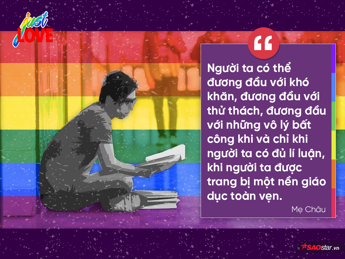 “Người ta có thể đương đầu với khó khăn, đương đầu với thử thách, đương đầu với những vô lý bất công khi và chỉ khi người ta có đủ lí luận, khi người ta được trang bị một nền giáo dục toàn vẹn.” - mẹ Châu chia sẻ. Vấn đề cốt lõi là người thuộc LGBT vẫn chưa hiểu hết về bản thân của mình, chưa hiểu về kiến thức cộng đồng… Chính vì vậy, họ vẫn còn ngập ngừng trong công cuộc đứng lên bảo vệ quyền lợi của mình. Người thuộc LGBT phải sống thật mạnh mẽ và tích cực. Đó mới chính là “vũ khí tối thượng” để đánh tan định kiến.