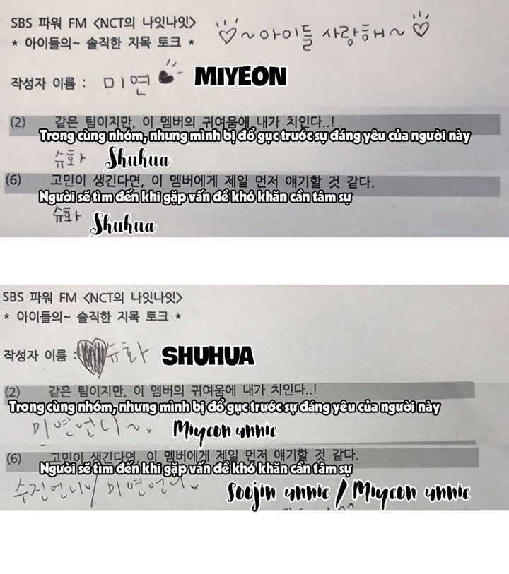 Nhưng tình cảm của cả hai không phải chỉ là ‘tình đơn phương’ bởi vì cô út Shuhua cũng rất yêu thương người chị cùng nhóm Miyeon của mình. Trong chương trình NCT Night Night chuyên mục ‘Trả lời thành thật’, cả hai chọn nhau là người sẽ tâm sự khi có vấn đề. Và đều nghĩ rằng đối phương rất đáng yêu. Sẽ không có gì là lạ khi Miyeon cho rằng Shuhua đáng yêu. Thế nhưng người hay ngại ngùng và lạnh lùng như Shuhua cũng khen Miyeon đáng yêu khiến fans không khỏi quắn quéo.