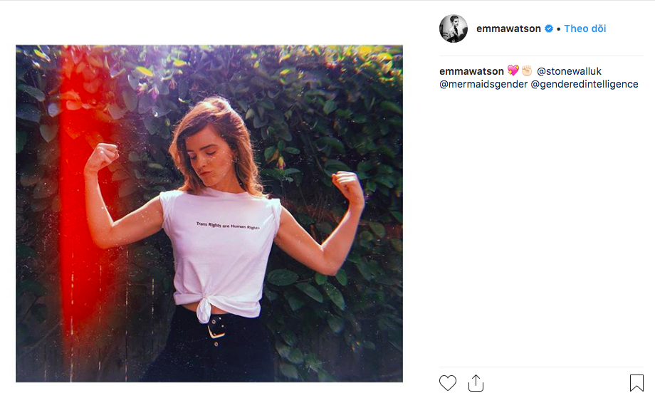 Vừa hôm trước, tấm ảnh mới nhất trên Instagram của Emma đã trở thành tâm điểm chú ý của nhiêu người. Trong ảnh, cô nàng tự tin khoe bắp tay của mình theo một phong cách “rất Emma” và khoác lên người chiếc áo mang dòng chữ “Trans Rights are Human Rights” (Quyền của người chuyển giới cũng là nhân quyền). Chưa dừng lại ở đó, cô còn nhấm mạnh thông điệp của mình bằng cách nhắc đến các tổ chức đang hoạt động về quyền của cộng đồng người chuyển giới bên dưới tấm ảnh bao gồm: Tổ chức từ thiên Stone Wall, Tổ chức từ thiện Mermaids Gender, Tổ chức phi lợi nhuân All About Trans và Gender Intelligence.