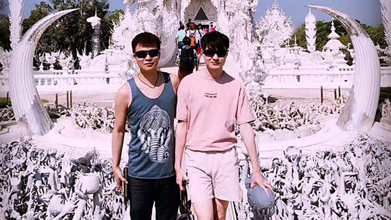Liu và Xu trước điện thờ tại tỉnh Chiang Rai, Thái Lan