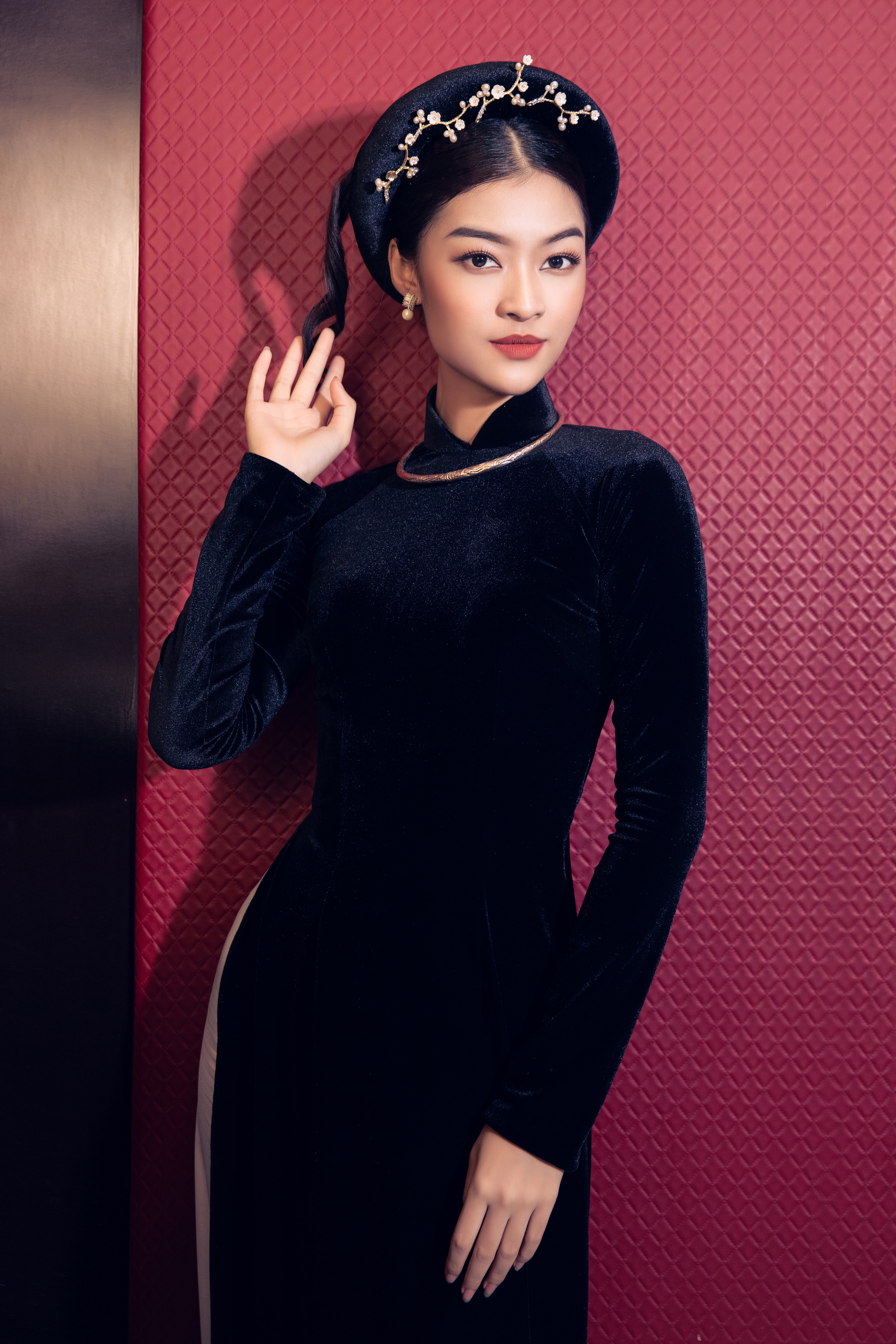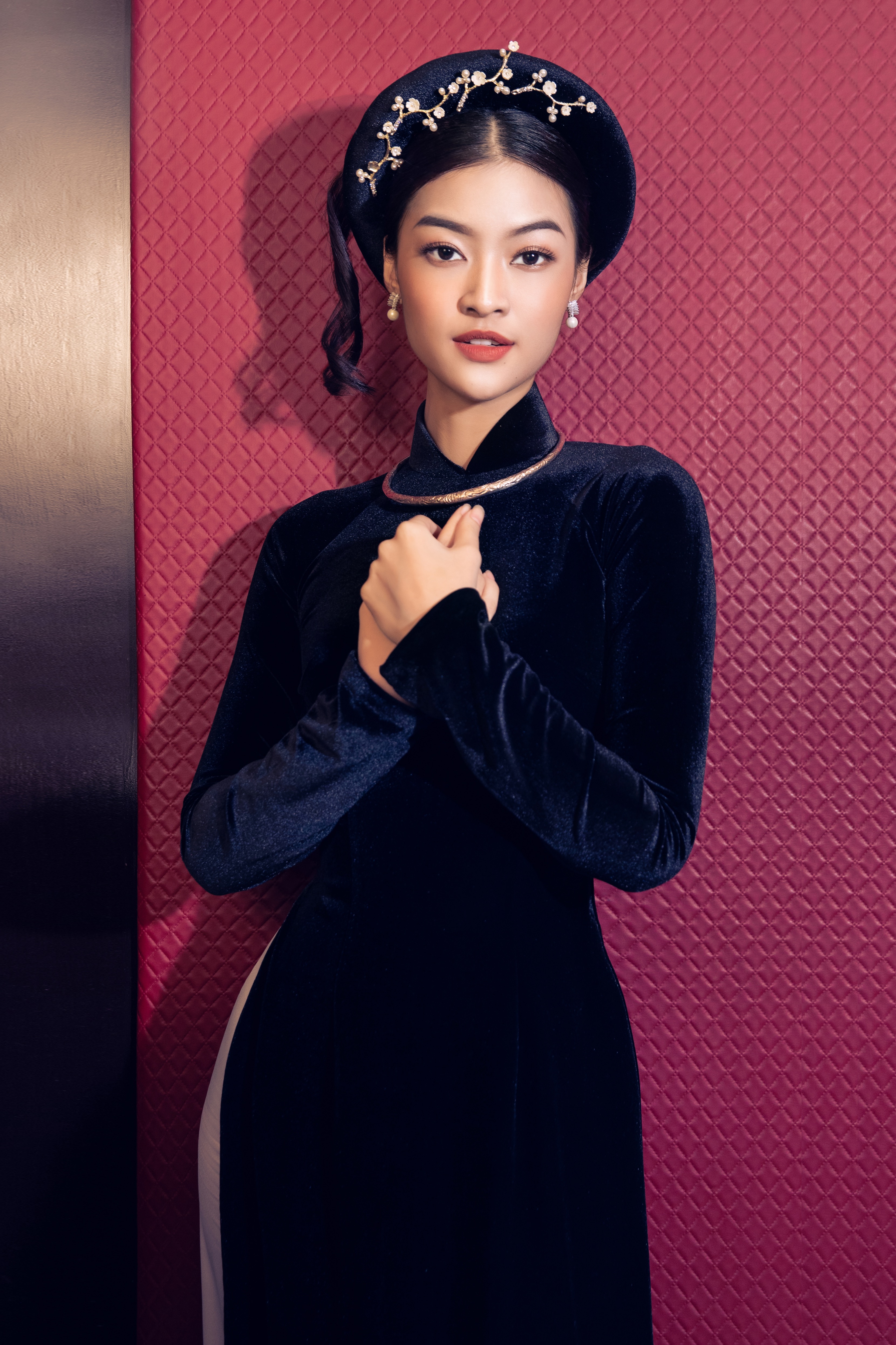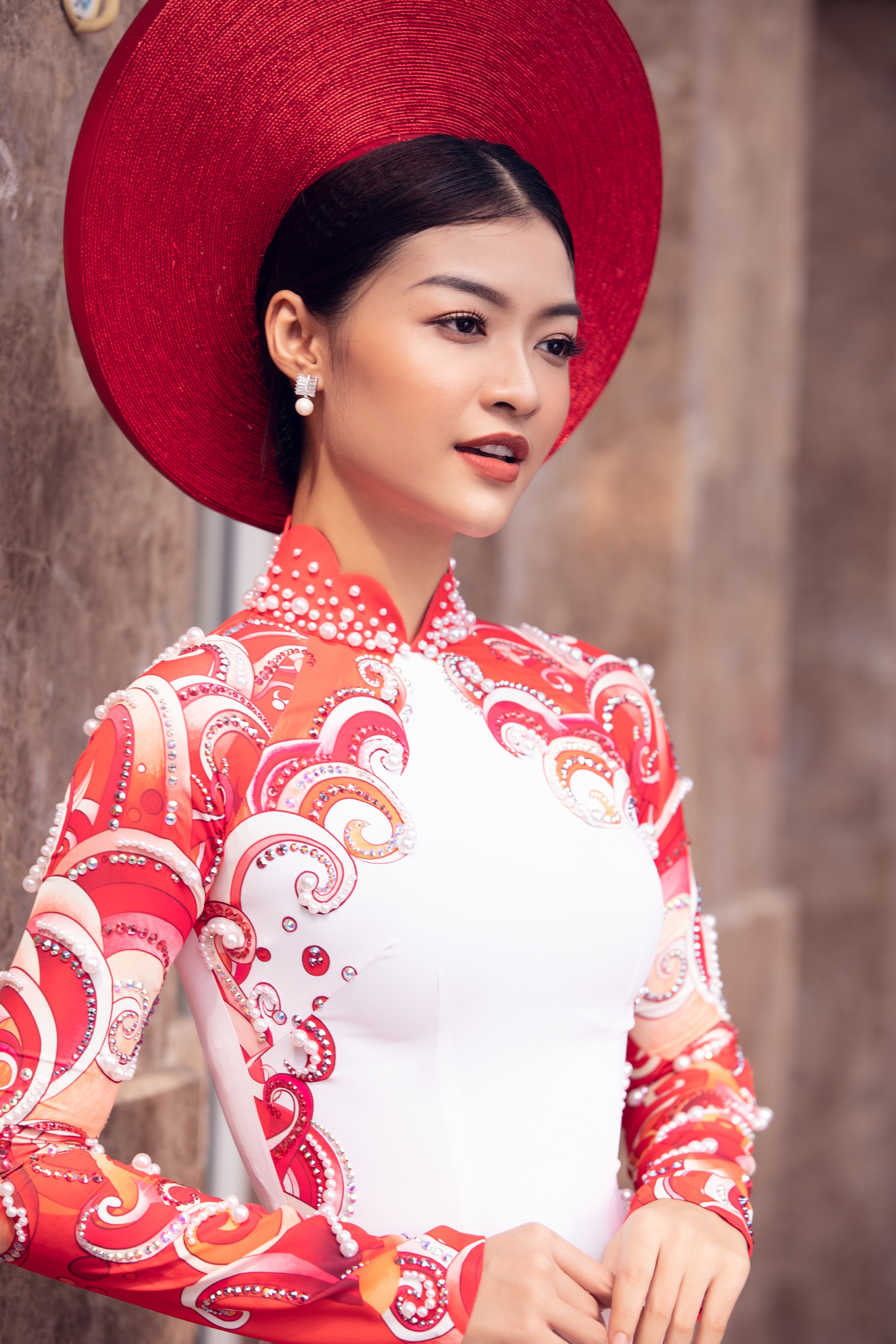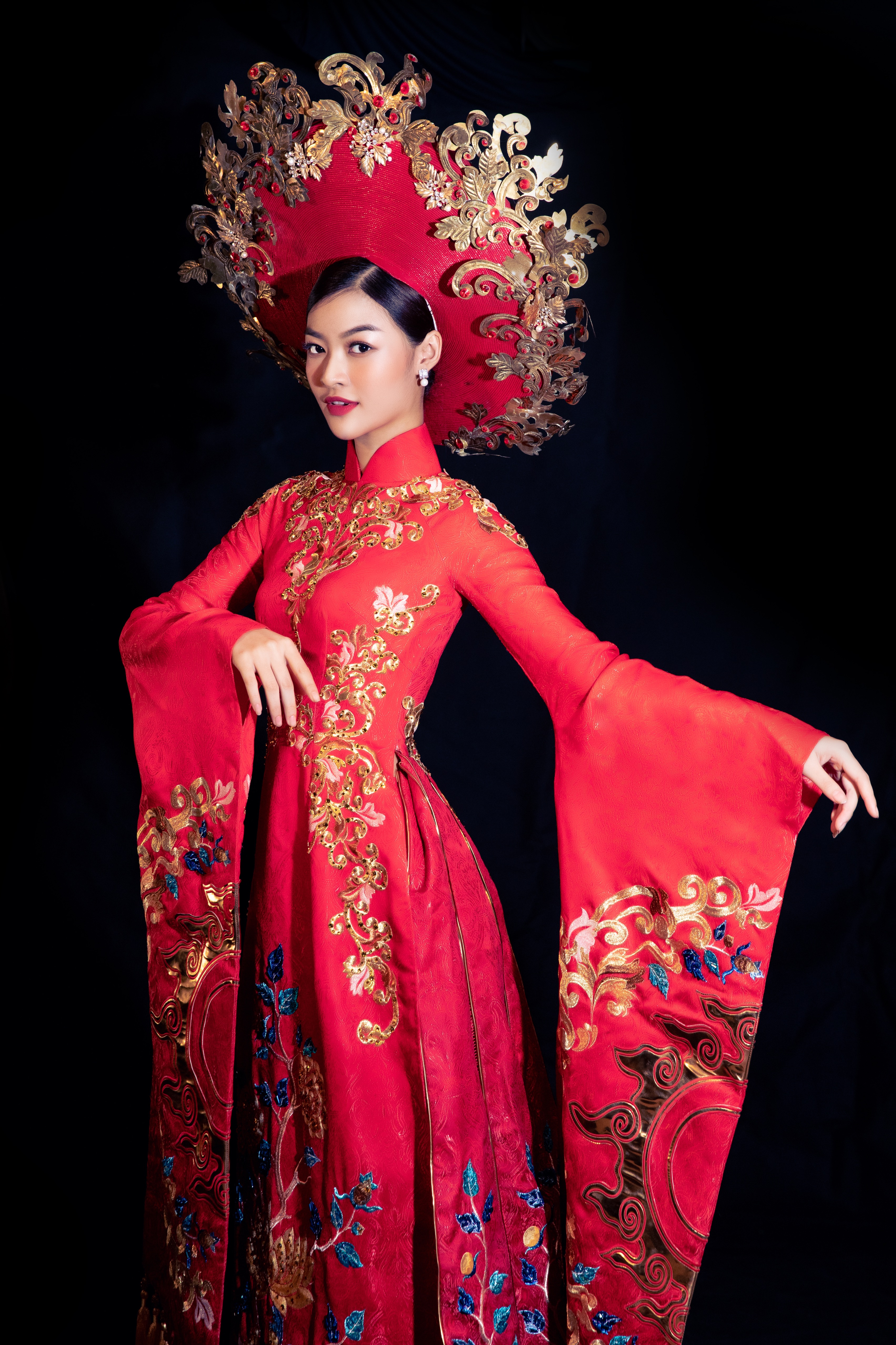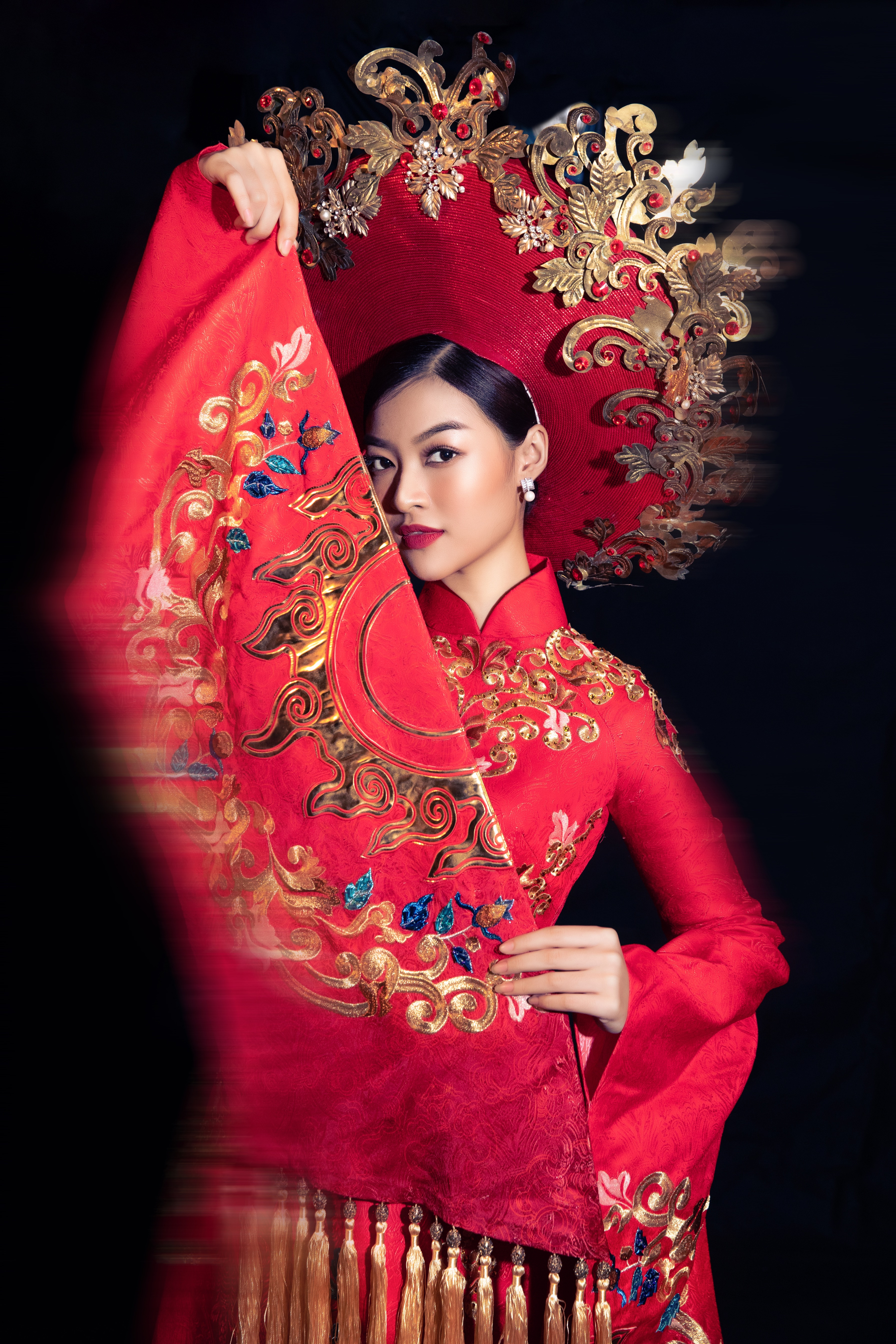 Mới đây, người đẹp khoác lên mình bộ quốc phục từng được á hậu Huyền My mang đến cuộc thi Miss Grand International 2017. Lấy ý tưởng hoa văn và pháp lam cung đình Huế làm chủ đạo, với chất liệu gấm tông màu đỏ vàng trên thân áo dài, vẻ đẹp của Kiều Loan lại thêm kiêu sa và quý tộc như dưới triều đại nhà Nguyễn.