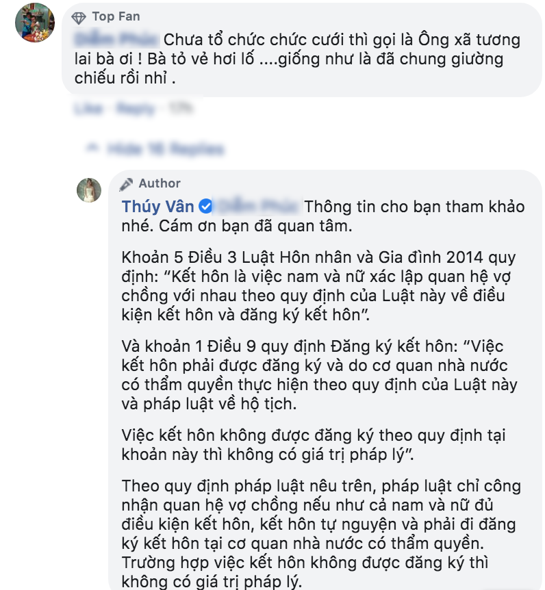 Chia sẻ khoảnh khắc hạnh phúc bên ông xã với khán giả hâm mộ, Thúy Vân bất ngờ bị fan khuyên không nên gọi Nhật Vũ là “chồng” vì cho rằng người đẹp chưa tiến hành hôn lễ thì không nên xưng hô như thế: “Chưa tổ chức chức cưới thì gọi là ‘Ông xã tương lai’ bà ơi! Bà tỏ vẻ hơi lố…giống như là đã chung giường chiếu rồi nhỉ?”.