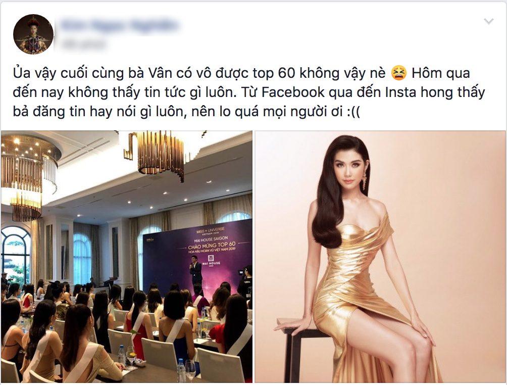 Một fan sắc đẹp đặt nghi vấn liệu Thúy Vân có lọt khỏi Top 60 cuộc thi Hoa hậu Hoàn vũ Việt Nam 2019 vì những ngày qua, người đẹp không có bất kỳ cập nhật trạng thái nào về cuộc thi. Lý do này đã khiến người hâm mộ vô cùng hoang mang và lo lắng.