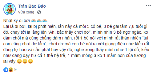 Dòng tâm thư được anh ghi lại trong buổi chiều đi bơi và vô tình gặp đám trẻ em, chỉ sau tích tắc BB Trần được nhận danh hiệu bậc thầy chơi dơ khiến fan cười “ngã ngửa”.