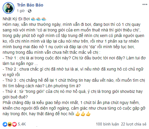 BB Trần có sức hút mãnh liệt tại hồ bơi, trước đó không lâu trong một lần đi bơi anh cũng gặp tình huống dở khóc dở cười khi được người phụ nữ mua bán đất mời chào mua nhà với nội dung “trong giới của em ai muốn thuê nhà giới thiệu chị” cũng khiến fan “cười xỉu” với tình cảnh nghiệt ngã này.