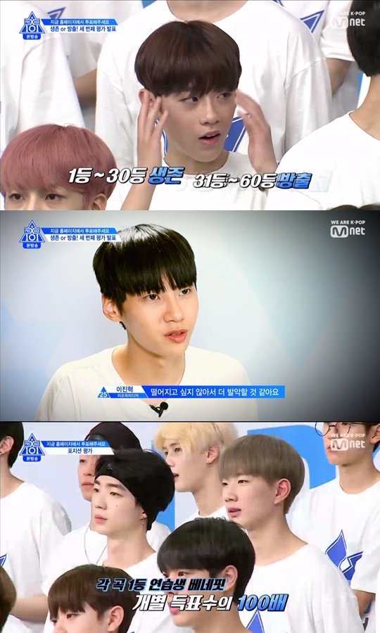 Thực tập sinh Lee Jinhyunk của T.O.P Media lo lắng cho biết: “Vị trí của tôi thực sự rất nguy hiểm. Vị trí số 25 chưa hẵn đã an toàn và có thể bị loại bất cứ lúc nào”.