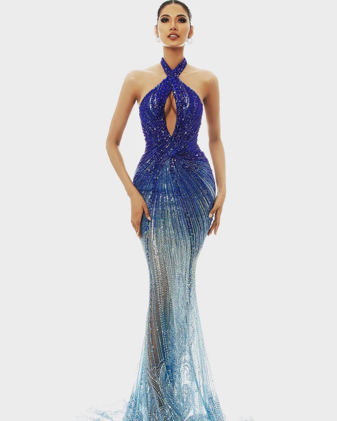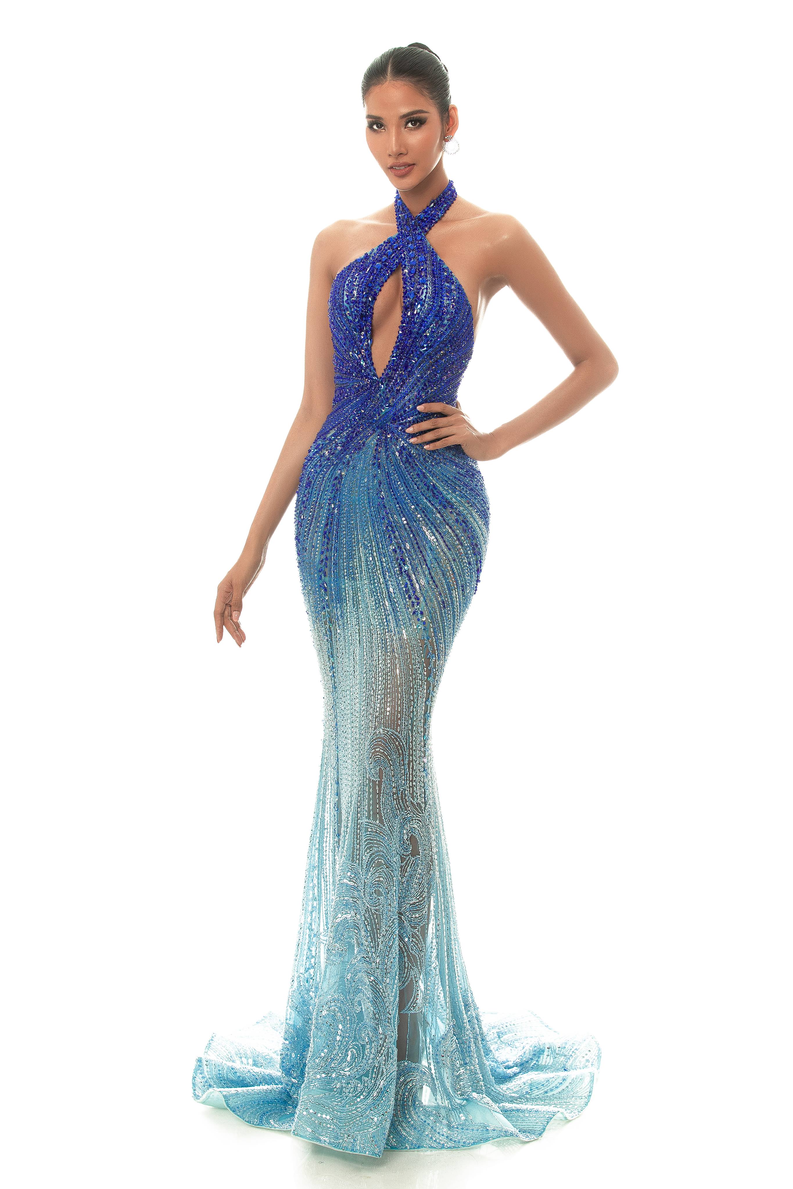 Mới đây, hình ảnh trọn vẹn bộ trang phục Hoàng Thùy diện trong đêm chung kết đã được tung ra. Mẫu thiết kế ôm sát body giúp người đẹp khoe triệt để đường cong hút mắt. Sắc xanh biển bắt mắt cùng việc đính lấp kết lấp lánh ở phần thân váy sẽ tạo hiệu ứng bắt sáng trên sân khấu giúp người đẹp Thanh Hóa có màn trình ghi điểm.