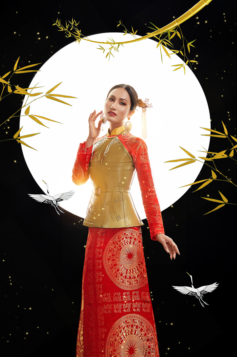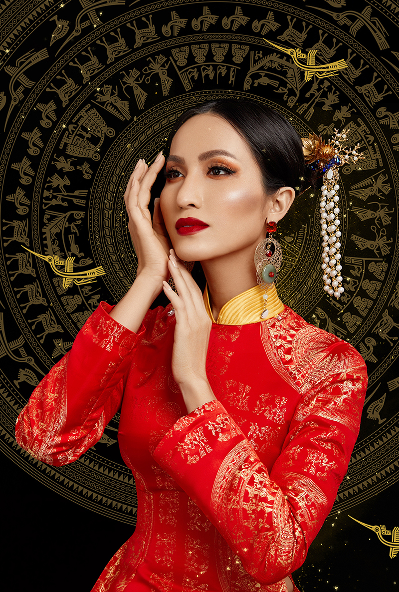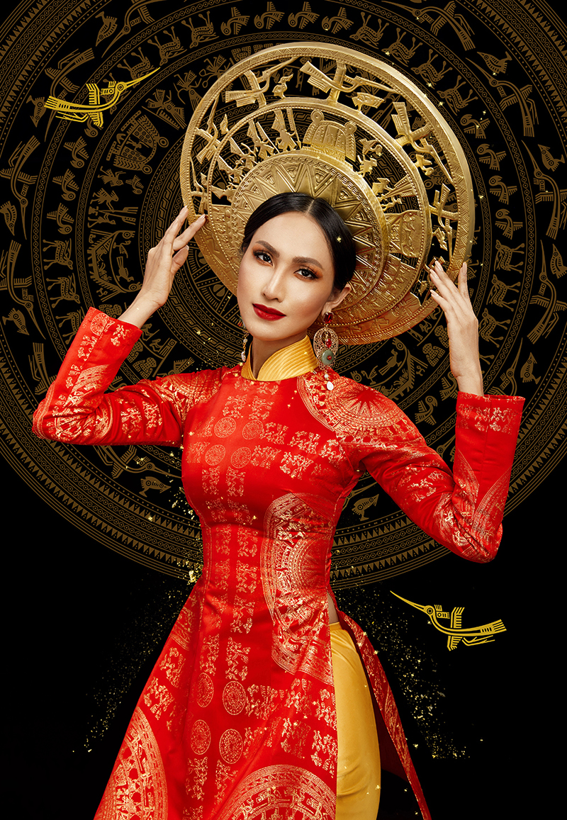 Tông màu chủ đạo là màu đỏ và màu vàng đồng được cách điệu trên tà áo dài vừa toát lên vẻ uy nghiêm nhưng lại mang đậm đà bản sắc văn hóa dân tộc Việt.