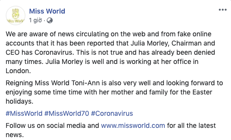 Nguyên văn bài viết trên trang chủ Miss World đăng tải: “Chúng tôi nhận được nhiều nguồn tin từ các tài khoản giả mạo trên mạng xã hội cho rằng bà Julia Morley - Chủ tịch của Miss World đã bị nhiễm virus Corona. Nhưng tin tức này hoàn toàn không chính xác. Bà Julia Morley vẫn trong tình trạng sức khỏe tốt và đang làm việc tại văn phòng ở Luân Đôn”.