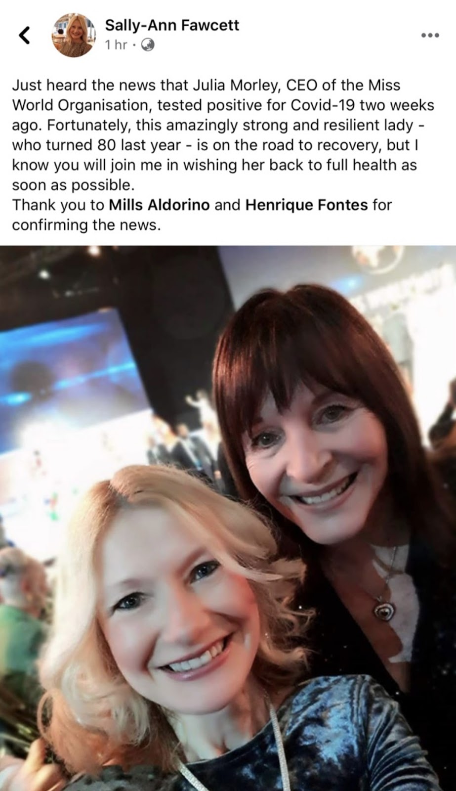 Mới đây, fan sắc đẹp thể hiện sự lo lắng trước thông tin chủ tịch Miss World - bà Julia Morley được xác nhận dương tính với virus Covid-19 tại Anh. Đây là 1 tin buồn với người hâm mộ cuộc thi Hoa hậu Thế giới.