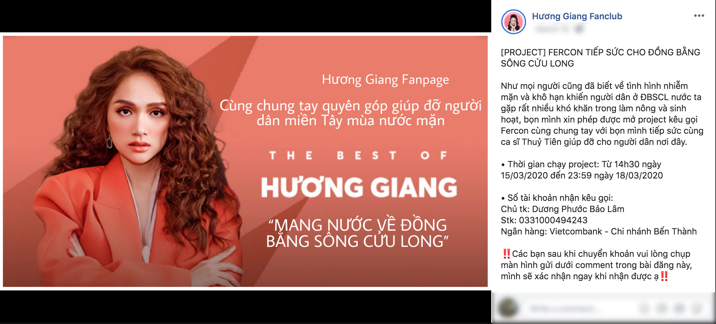 Đạt được 3 triệu lượt theo dõi trên Instagram, người hâm mộ tự hào khi Hương Giang trở thành hoa hậu có lượng theo dõi “khủng” nhất. Bên cạnh sự vui mừng dành cho thần tượng, cộng đồng fanclub của hoa hậu Hương Giang - FERCON kêu gọi quyên góp giúp đỡ bà con miền Tây vượt qua hạn mặn.