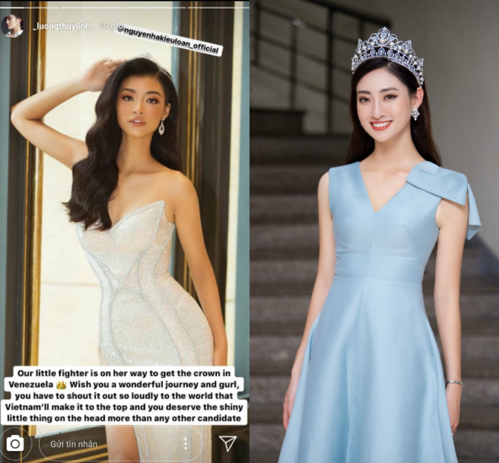 Bên cạnh các đàn chị, 2 nàng hậu cùng kề vai sát cánh với Kiều Loan trong Top 3 Miss World Vietnam 2019 cũng gửi lời chia sẻ và động viên. Hoa hậu Lương Thùy Linh nhắn nhủ: “Chiến binh nhỏ của chúng ta sẽ giành lấy vương miện tại Venezuela bằng chính khả năng của cô ấy. Chúc Loan sẽ có một hành trình tuyệt vời và tỏa sáng. Loan phải chứng minh cho thế giới thấy Việt Nam hoàn toàn có thể dẫn đầu và Loan xứng đáng được đội vương miện hơn bất kỳ thí sinh nào khác”.