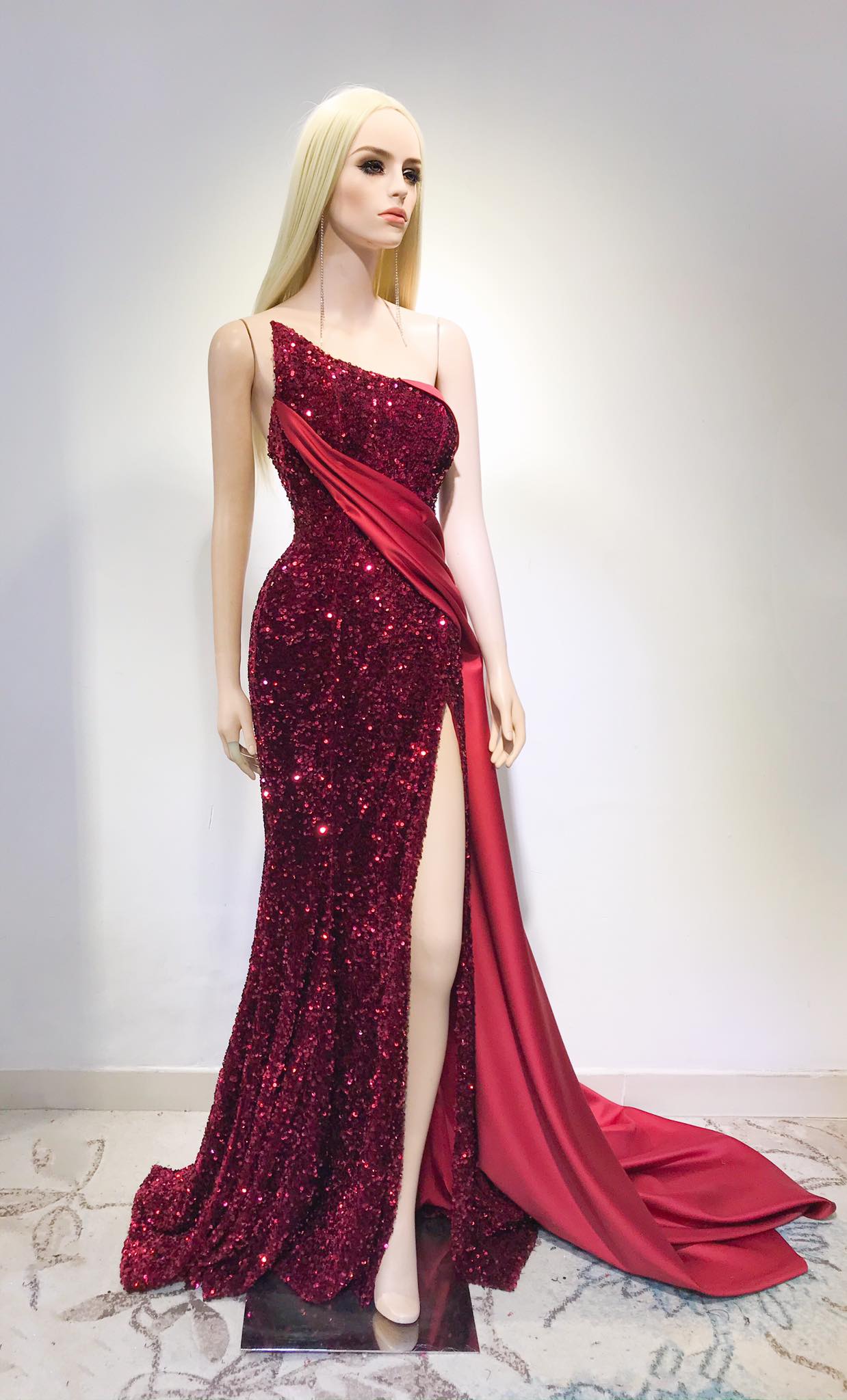 Với tông màu đỏ chủ đạo cùng kĩ thuật xếp nếp tinh tế, bộ váy màu đỏ bắt mắt này được đánh giá là phù hợp với Hoài Sa khi giúp cô khoe được phần xương vai mảnh khảnh. Phần thân váy xẻ đùi cũng khiến Hoài Sa trông kiêu hãnh và khoe triệt để đôi chân thon dài của mình.