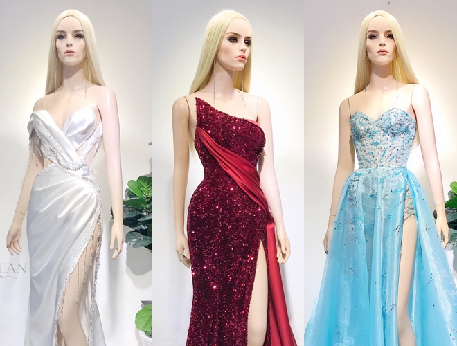 Ba bộ váy dạ hội được Hoài Sa mang đến Thái Lan để mặc cho đêm thi quan trọng nhất của cuộc thi Miss International Queen.