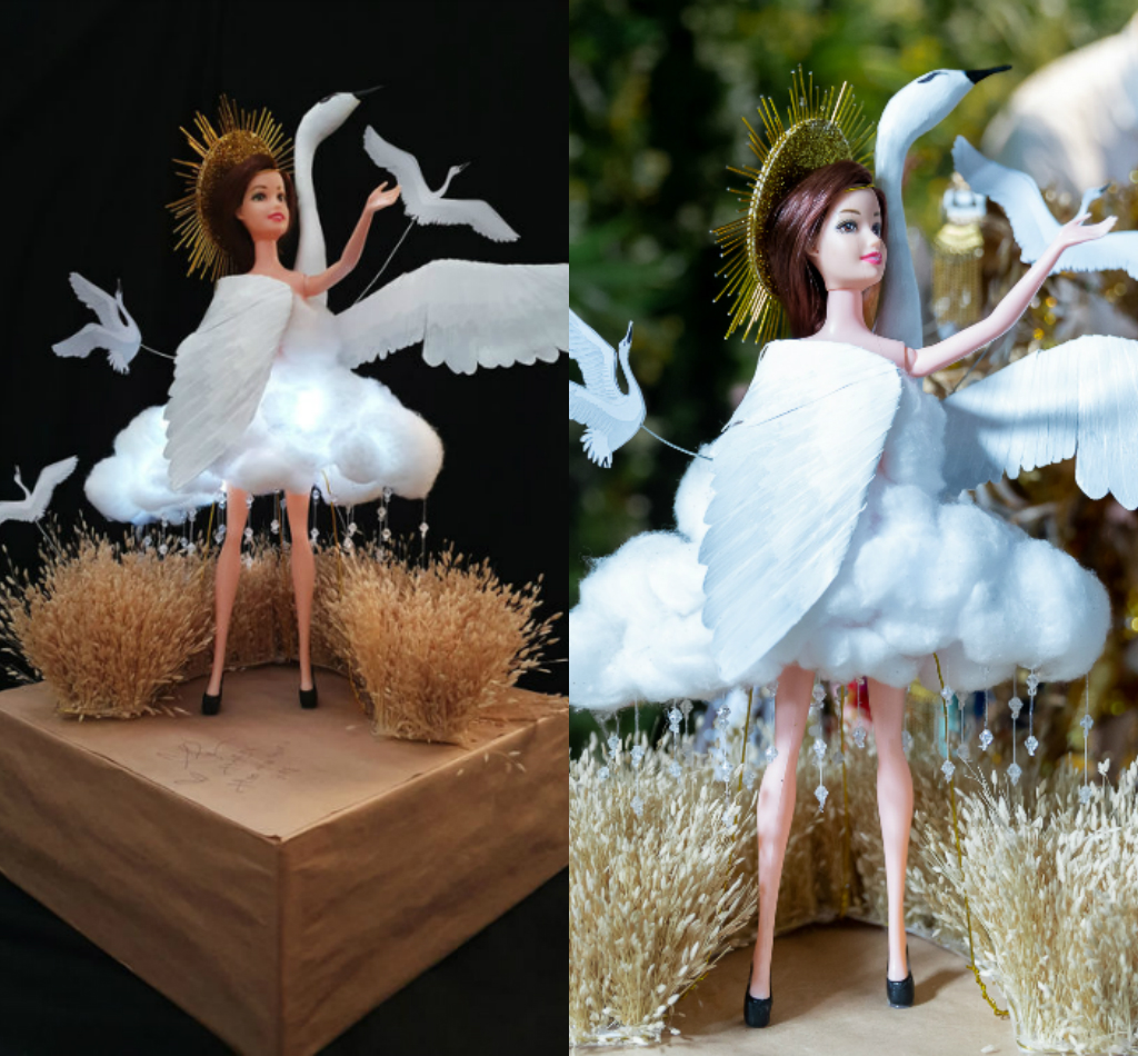 Bên cạnh đôi cánh khổng lồ vô cùng ấn tượng có thể điều khiển thu vào và xoè ra, bộ “Con cò” có hiệu ứng đèn sáng ở đám mây, hiệu ứng mưa rơi từ những chuỗi kim sa lấp lánh và cánh đồng lúa được dựng thành mô hình thực tế ở phần tà sau, khiến bộ trang phục càng thêm hoành tráng và nổi bật.