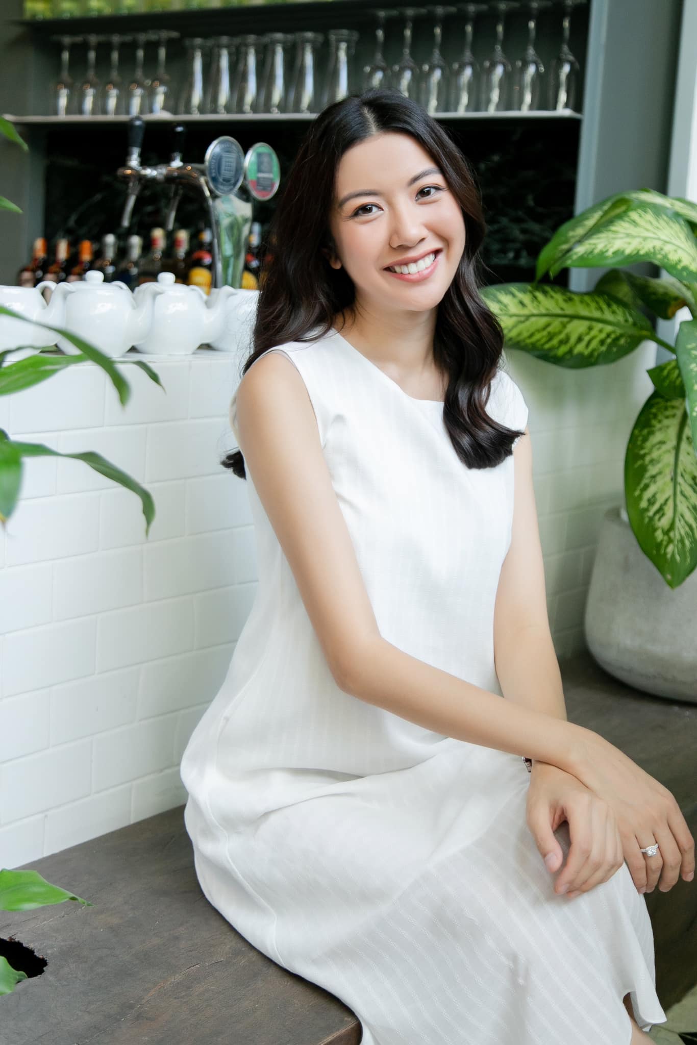 Á hậu Thúy Vân diện váy trắng khoe nụ cười dịu dàng, duyên dáng.