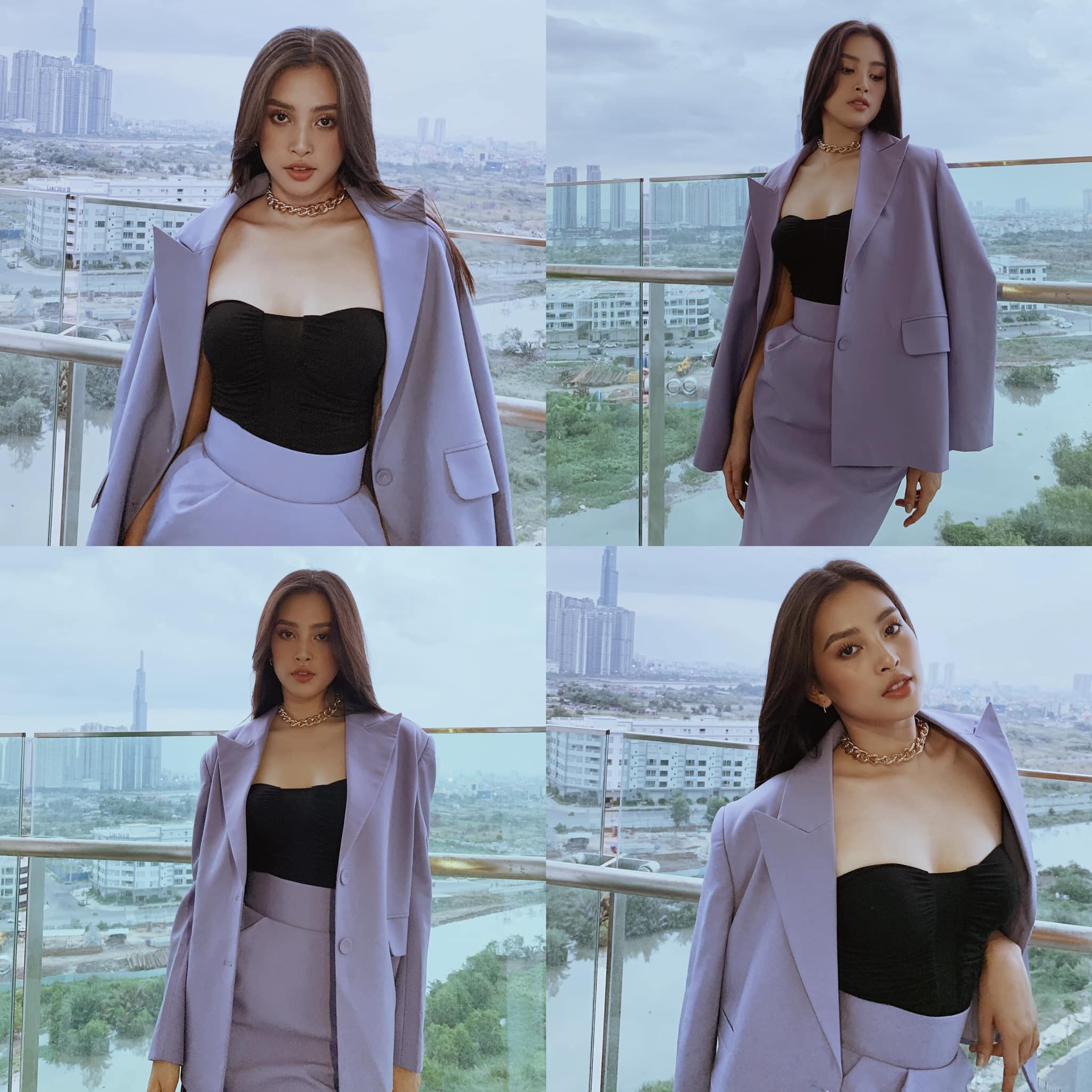 Tiểu Vy diện suit tím thanh lịch nhưng vẫn không kém phần quyến rũ.