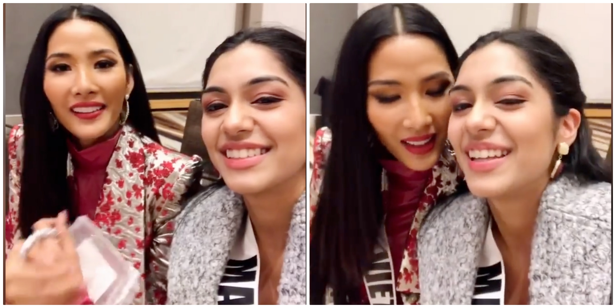 Hình ảnh á hậu Hoàng Thùy đọ dáng bên cạnh đương kim hoa hậu Catriona Gray khiến người hâm mộ bấn loạn vì nhan sắc có phần lấn át của đại diện Việt Nam.