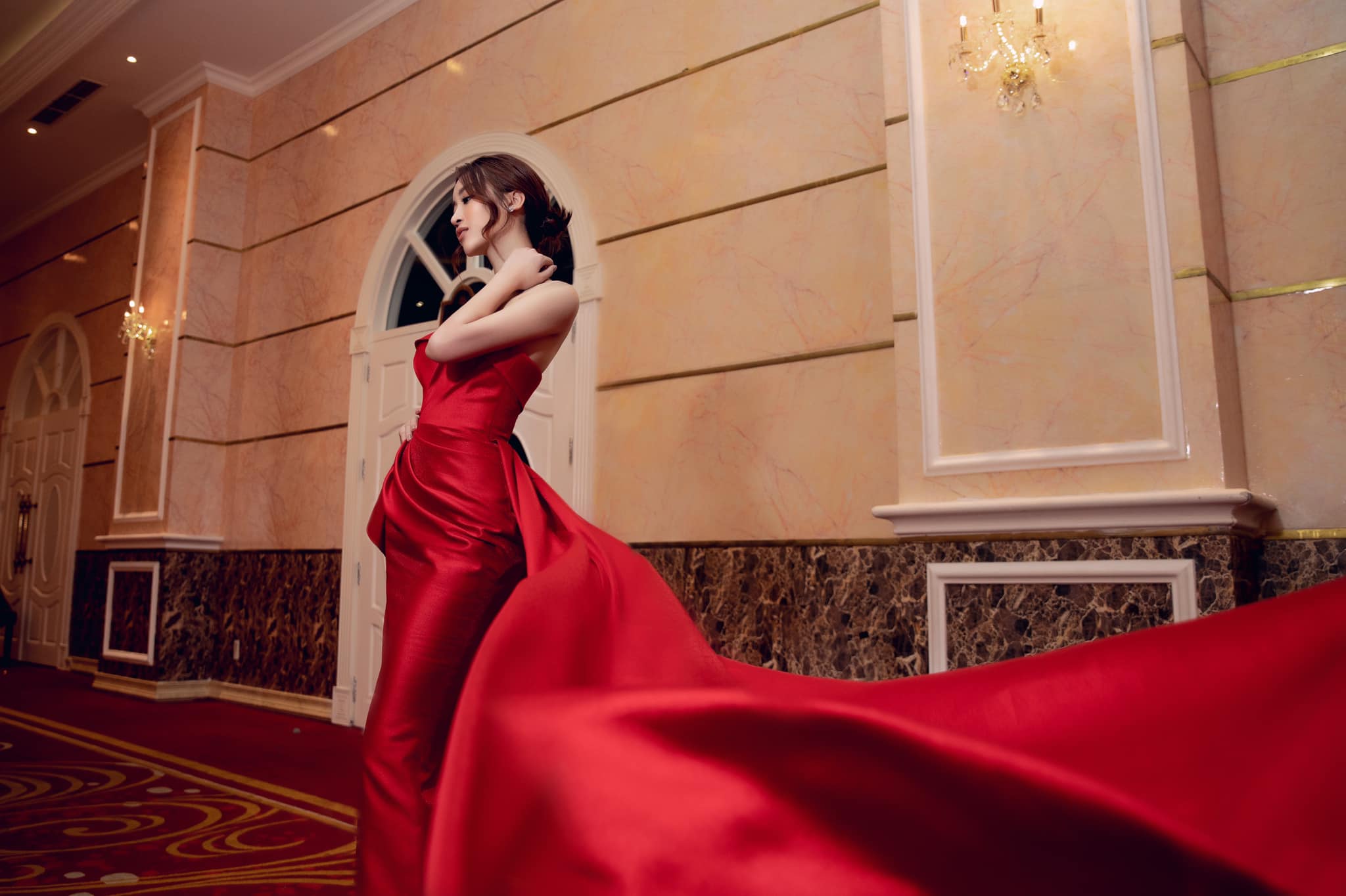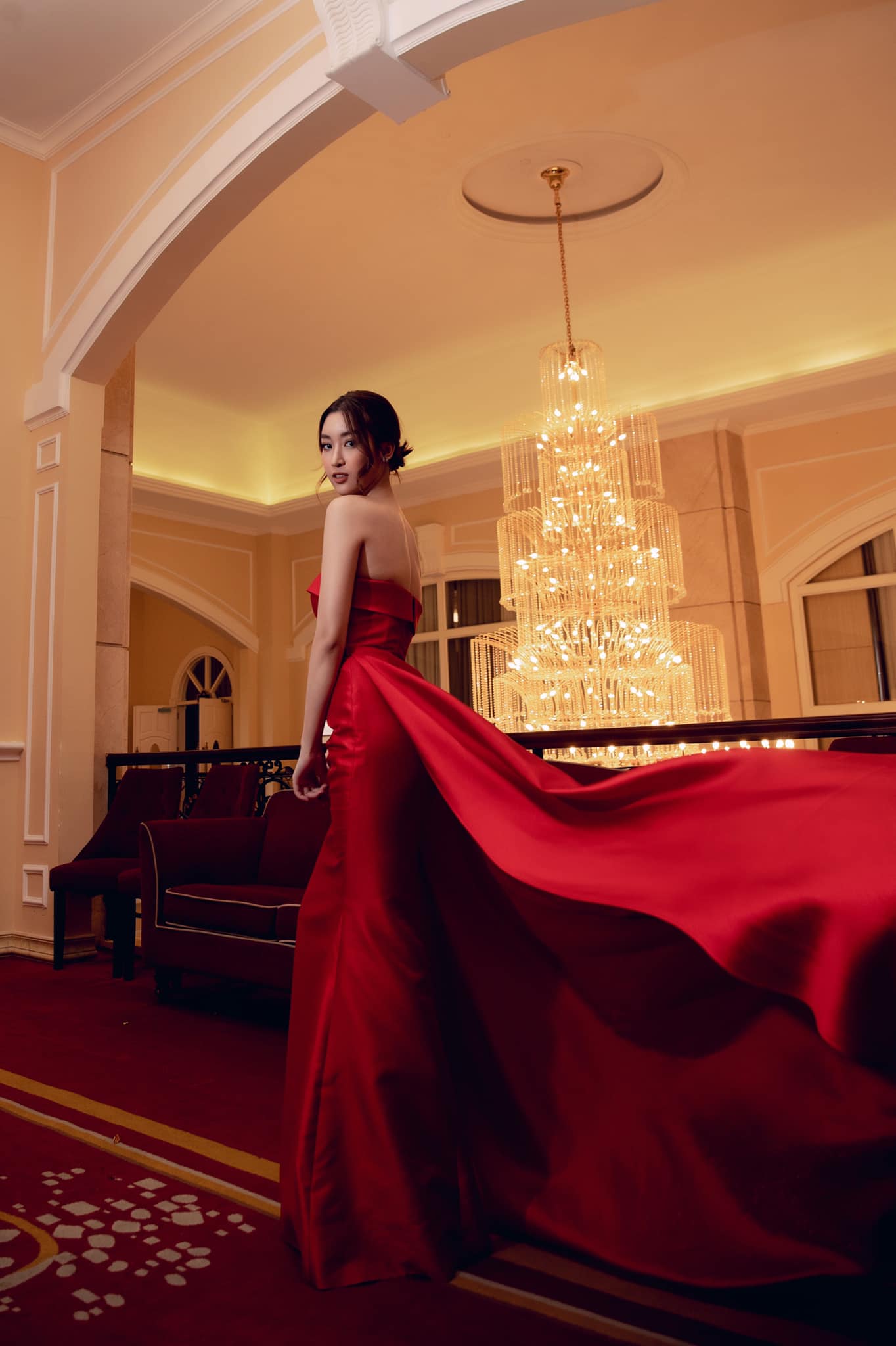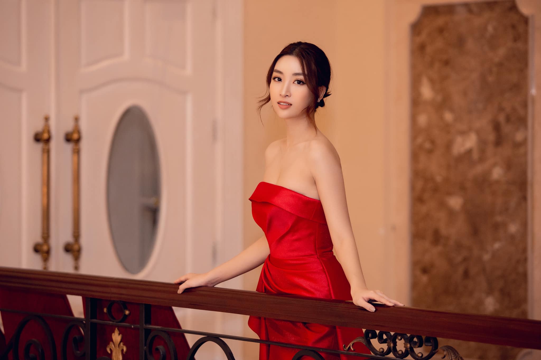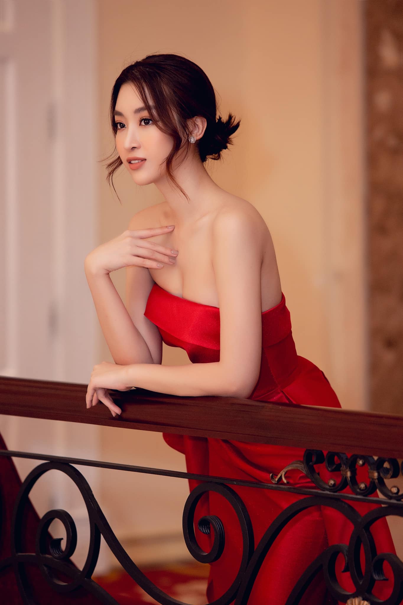 Diện đầm dạ hội đỏ của NTK Lê Ngọc Lâm để lộ vai trần gợi cảm, Hoa hậu Việt Nam 2016 cuốn hút fan bằng layout make-up đẹp sắc sảo và mái rẻ ngôi quyến rũ. Dù kết thúc nhiệm kỳ hoa hậu nhưng sức hút của Đỗ Mỹ Linh đối với fan sắc đẹp vẫn còn rất lớn.