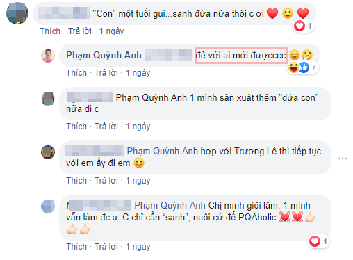 Dòng bình luận của Phạm Quỳnh Anh với nội dung “Đẻ với ai” khi được hỏi “Con một tuổi rồi, sinh thêm đứa nữa chị ơi” tạo ra cụm từ đa nghĩa. Thực tế, một mặt chính vì quá yêu mến bản MV “Tất cả sẽ thay em” nên mọi người ủng hộ ca sĩ họ Phạm nên ra mắt phần 2 để chiều lòng người nghe. Mặt khác câu trả lời chắc như cột cầu của ca sĩ gốc Hà Nội như một lời tuyên bố bản thân cô vẫn chưa nghĩ đến chuyện đi bước nữa sau hôn nhân đổ vỡ. Trải qua một lần đò, bà mẹ 2 con có cái nhìn nhiều chiều hơn về cuộc sống.
