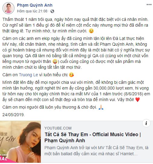 Phạm Quỳnh Anh gửi lời cảm ơn khán giả đã ủng hộ cho đứa con Tất cả sẽ theo em suốt một năm qua.