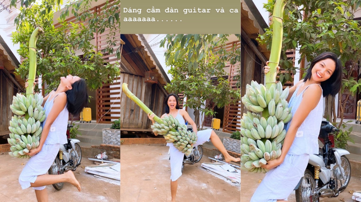 Hoa hậu H'Hen Niê rạng rỡ pose dáng với buồng chuối to khổng lồ tại quê nhà Đắk Lắk.