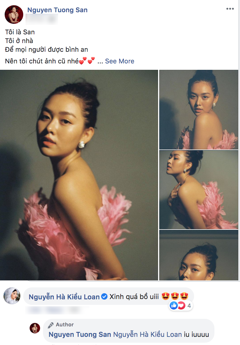 Chia sẻ những bức ảnh chụp với chiếc váy hồng hạc từng giúp hoa hậu Đỗ Mỹ Linh chiếm trọn spotlight, á hậu Tường San nhận được nhiều lời khen từ fan sắc đẹp. Lựa chọn bộ cánh ấn tượng và thời thượng nếu hoa hậu Đỗ Mỹ Linh từng “chặt” đẹp cả rừng hoa thì Tường Sang lại thể hiện màu sắc cổ điển đậm nét retro. Chiếc váy cầu kỳ được đính kết lông vũ hồng và xếp tầng tỉ mỉ giúp cả 2 nàng hậu tăng thêm độ nữ tính, đặc biệt là phần vai trần quyến rũ. Mặc dù diện thiết kế váy “đụng hàng” với đàn chị nhưng Tường San vẫn vô cùng xinh đẹp trong mắt của “người yêu” Kiều Loan.
