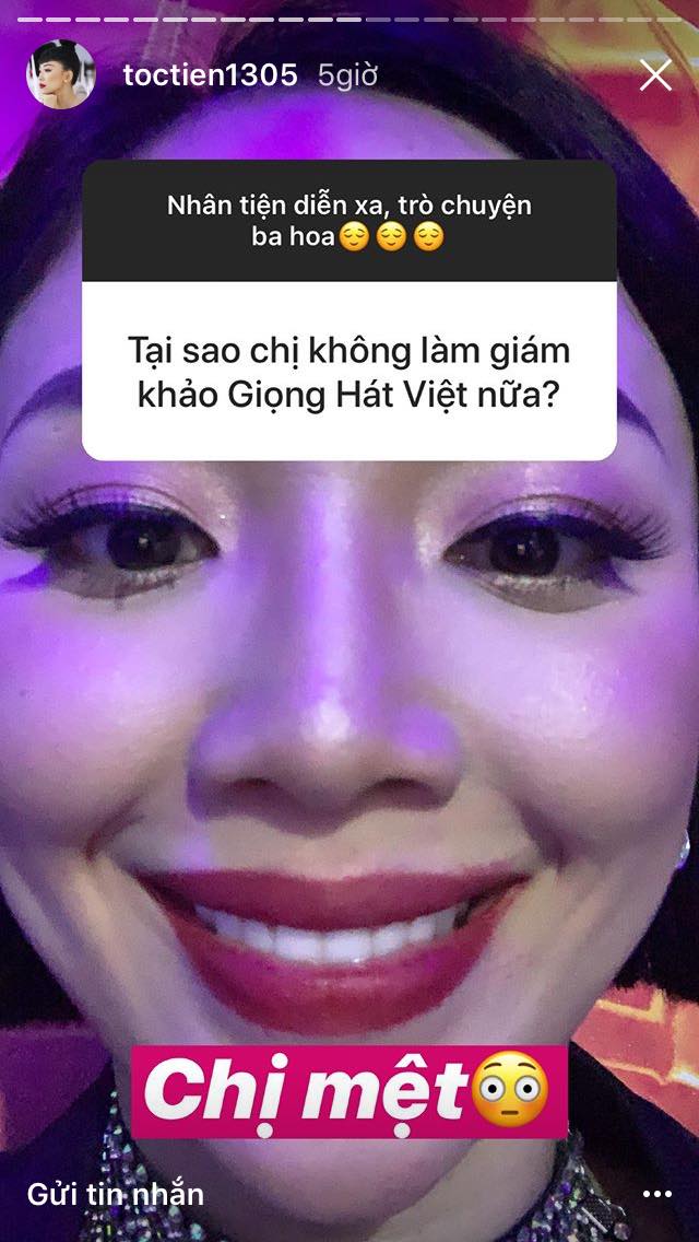 Dòng chia sẻ hỏi nhanh đáp nhanh được Tóc Tiên chia sẻ trên tài khoản Instagram trong chuyến lưu diễn ở xa khiến fans nhận được câu trả lời lí do cô không “lỡ hẹn” với The Voice 2019 là do: “Chị mệt”.