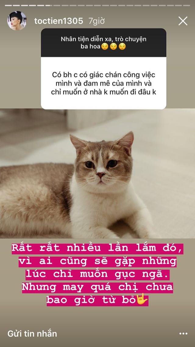 Khi được hỏi có khi nào chị chán nghề và đam mê, Tóc Tiên không ngần ngại đã rất nhiều lần muốn gục ngã, nhưng máu ngựa chiến và tình yêu ca hát khiến cô chưa bao giờ từ bỏ ước mơ.