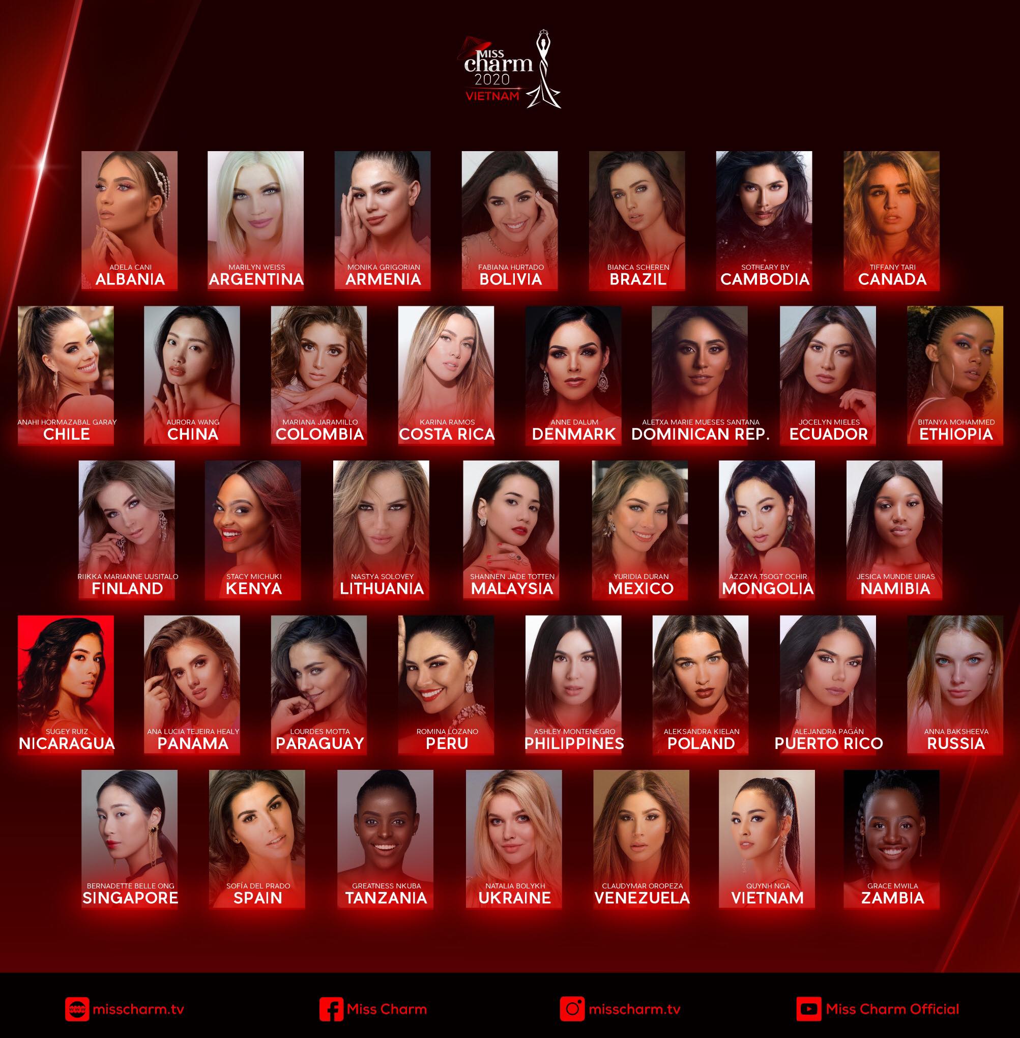 Miss Charm 2020 - Hoa hậu Sắc đẹp 2020 đang dần nóng lên bằng những con số biết nói khi quy tụ rất nhiều chiến binh nhan sắc lẫy lừng. Theo dự kiến đêm chung kết sẽ diễn ra vào ngày 17/3/2020 tại Việt Nam. Đại diện của nước chủ nhà chính là á khôi Quỳnh Nga.