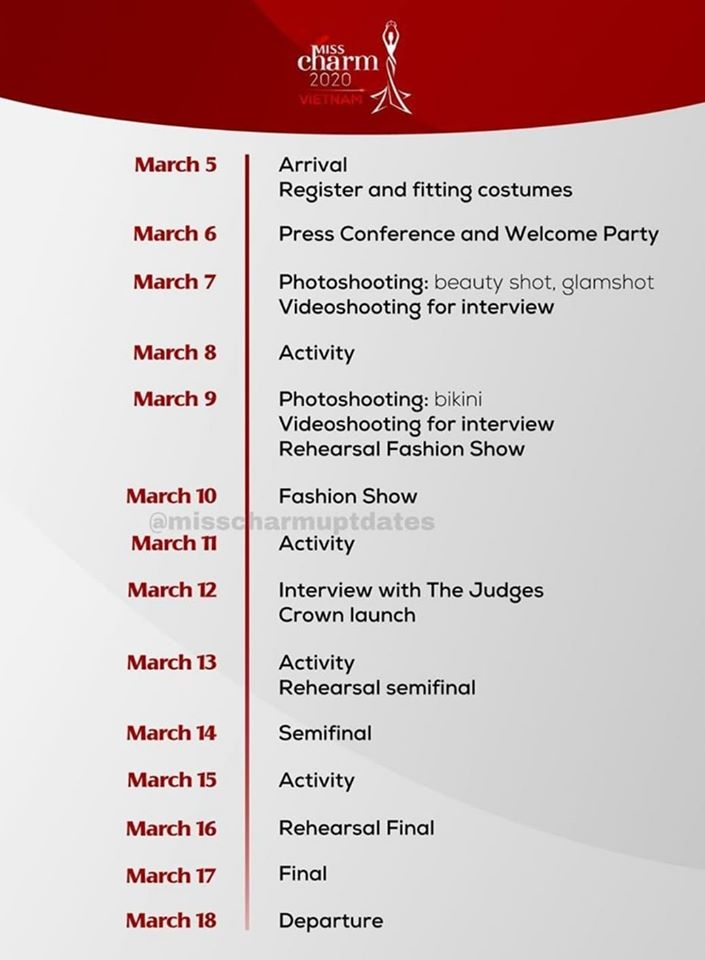 Mới đây, trên mạng xã hội vừa rò rỉ lịch trình mới nhất của cuộc thi và theo đó hành trình tìm ra chủ nhân của chiếc vương miện Miss Charm đầu tiên sẽ kéo dài 12 ngày (từ ngày 5/3/2020 và đêm chung kết vào ngày 17/3/2020). Như vậy Quỳnh Nga và các đại diện khác sẽ có tổng cộng 12 ngày để tỏa sáng. Nếu bám sát lịch trình cuộc thi năm nay thì cuộc thi có điểm mới chính là phần thi chụp ảnh Glamshot sẽ diễn ra vào ngày 7/3/2020. Đây được xem là phần thi hấp dẫn khiến fan mong chờ nhất.