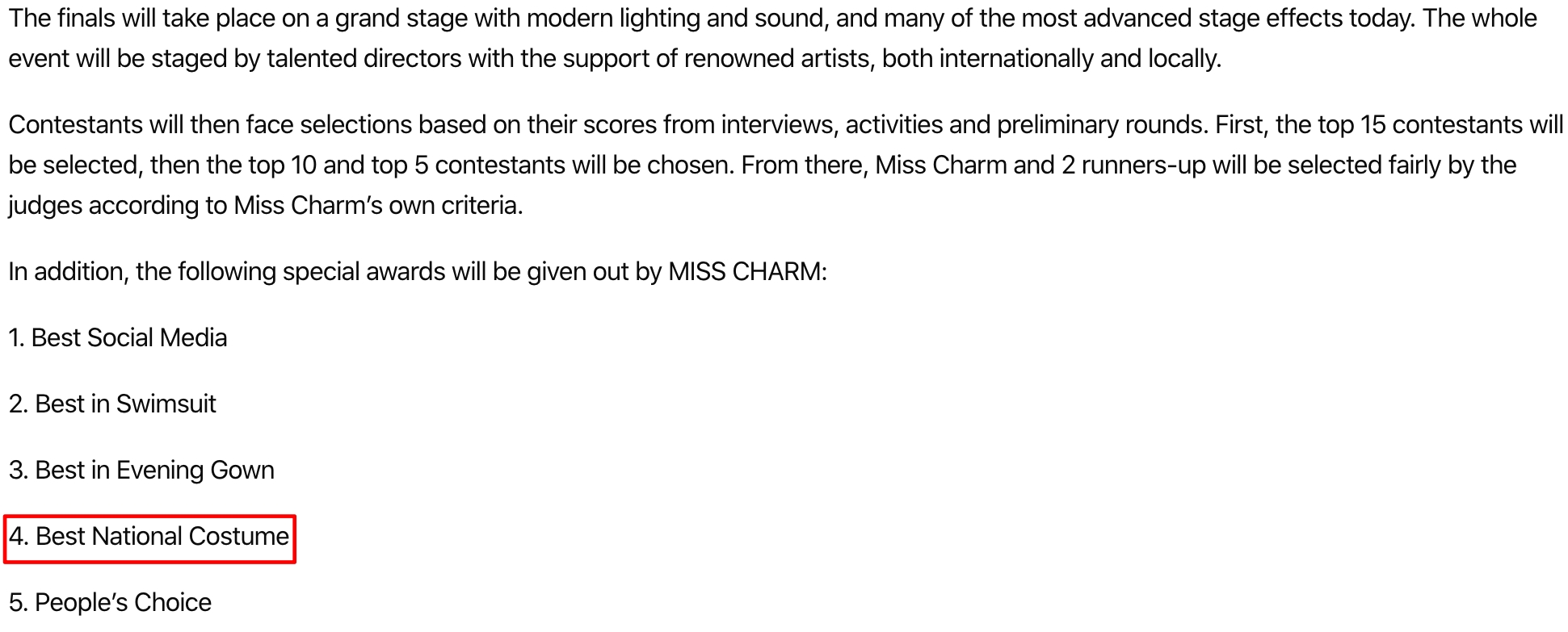 Tuy vậy, các fan vẫn chờ đợi thông tin từ Miss Charm vì trước đó, cuộc thi đã dự định trao 5 giải phụ trong đó có Trang phục dân tộc đẹp nhất”.