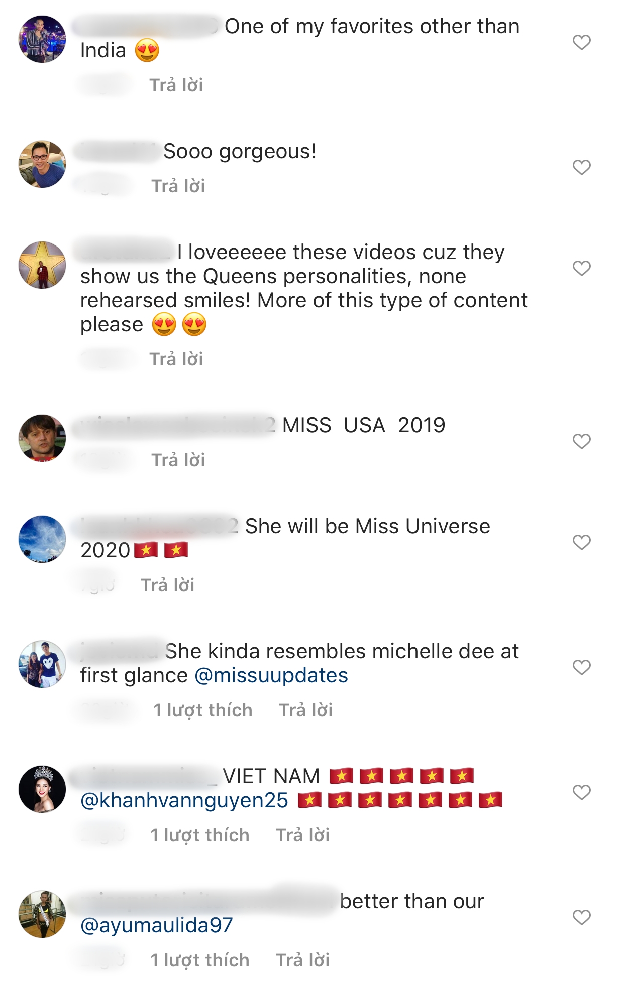 Nhiều lời khen “có cánh” dành cho Khánh Vân như: “Đại diện Việt Nam năm nay thật tuyệt vời”, “Cô ấy xinh đẹp như một nữ thần” hay “nhan sắc này thật lộng lẫy”,… Bên cạnh đó, một khán giả người Indonesia nhận xét rằng: “Cô ấy còn tuyệt vời hơn cả hoa hậu của chúng tôi“.