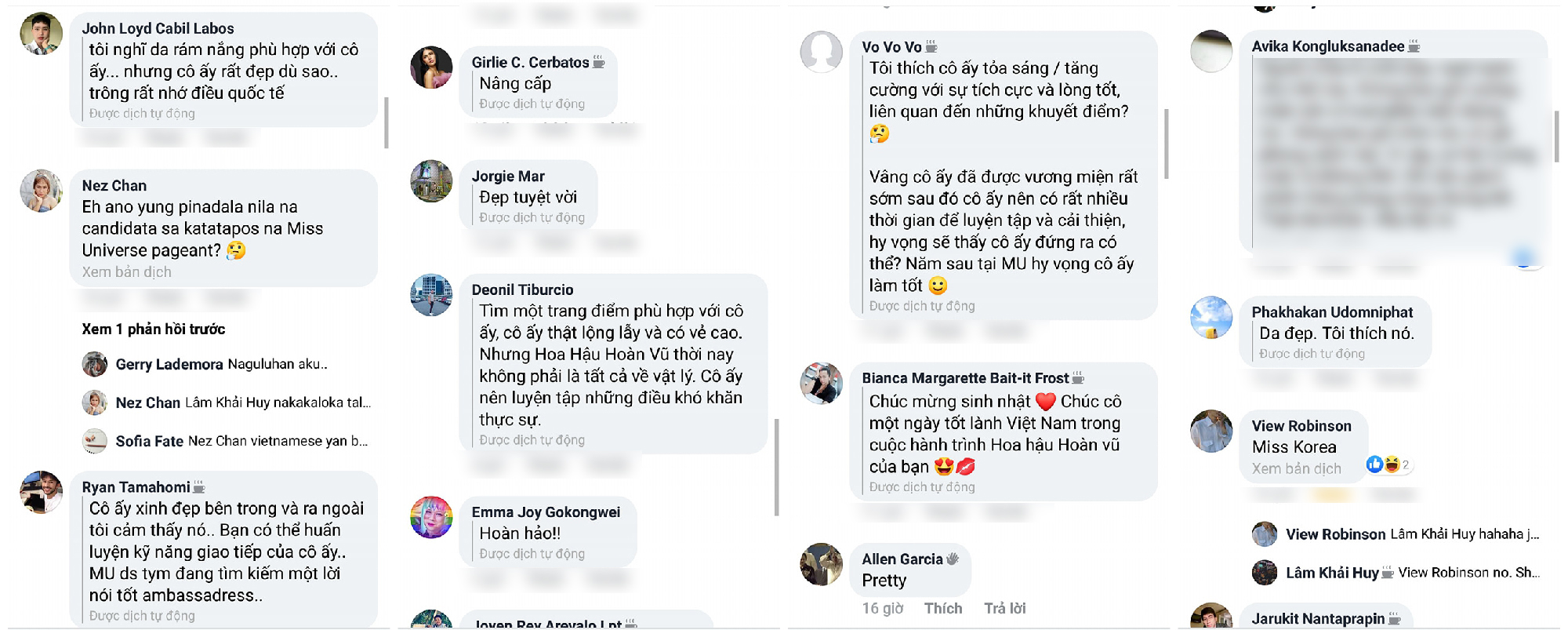 Bên cạnh lượng tương tác “khủng”, phần lớn khán giả ngoài nước nhận xét Khánh Vân sở hữu nhan sắc xinh đẹp và rạng rỡ. Tuy nhiên, họ cũng đưa ra góp ý rằng đại diện Việt Nam nên nhuộm lại màu da “bánh mật” để trông khỏe khoắn và năng lượng hơn, bởi vì vẻ đẹp hiện tại của cô nàng khá ngọt ngào chỉ hợp với Miss World hoặc Miss International. Đặc biệt, người đẹp cũng cần nỗ lực nhiều hơn để cải thiện kỹ năng ứng xử.