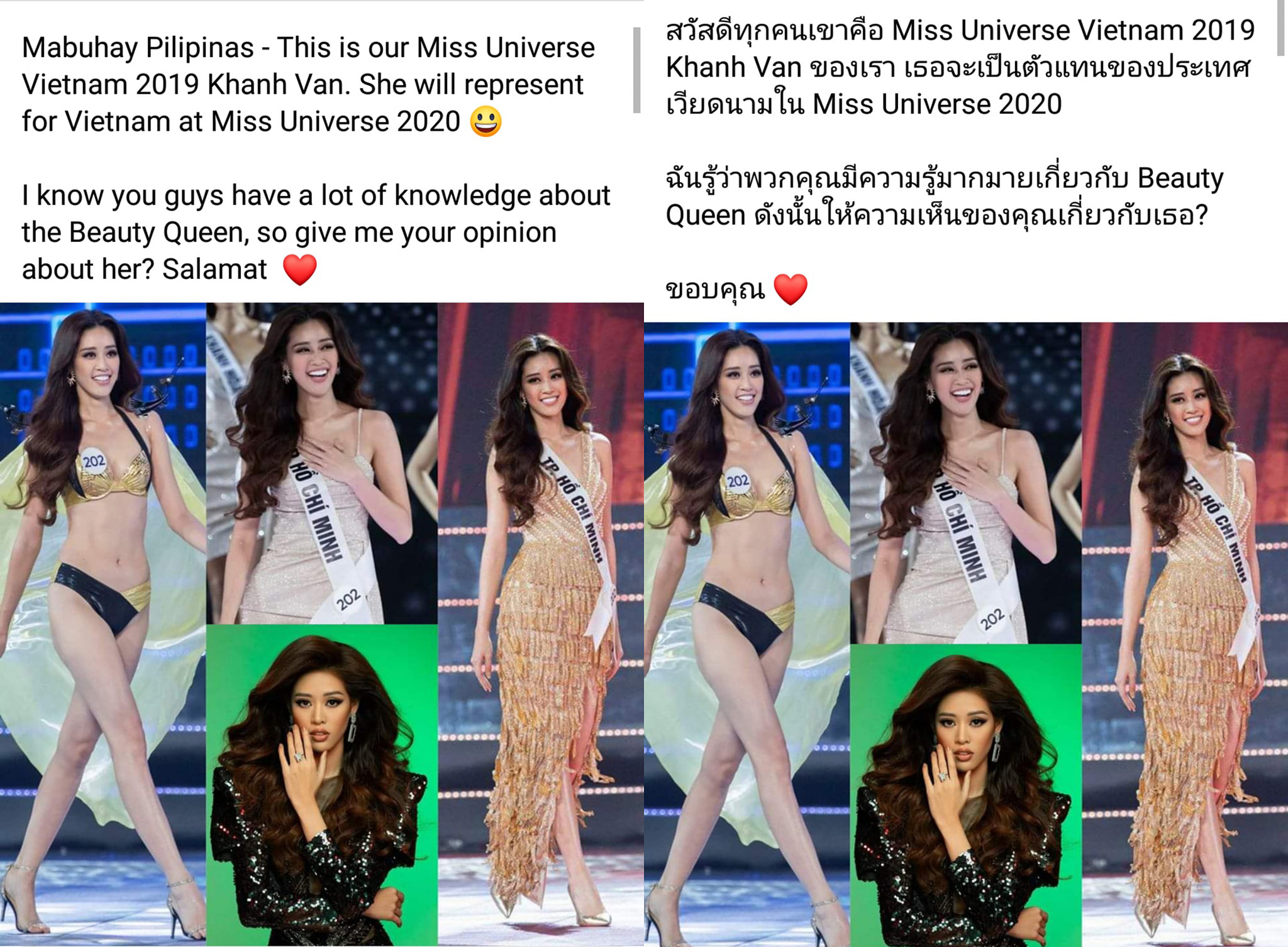 Một fan sắc đẹp đã đăng tải hình ảnh của Khánh Vân lên các diễn đàn nhan sắc Thái Lan và Philippines để thăm dò hiệu ứng của khán giả.