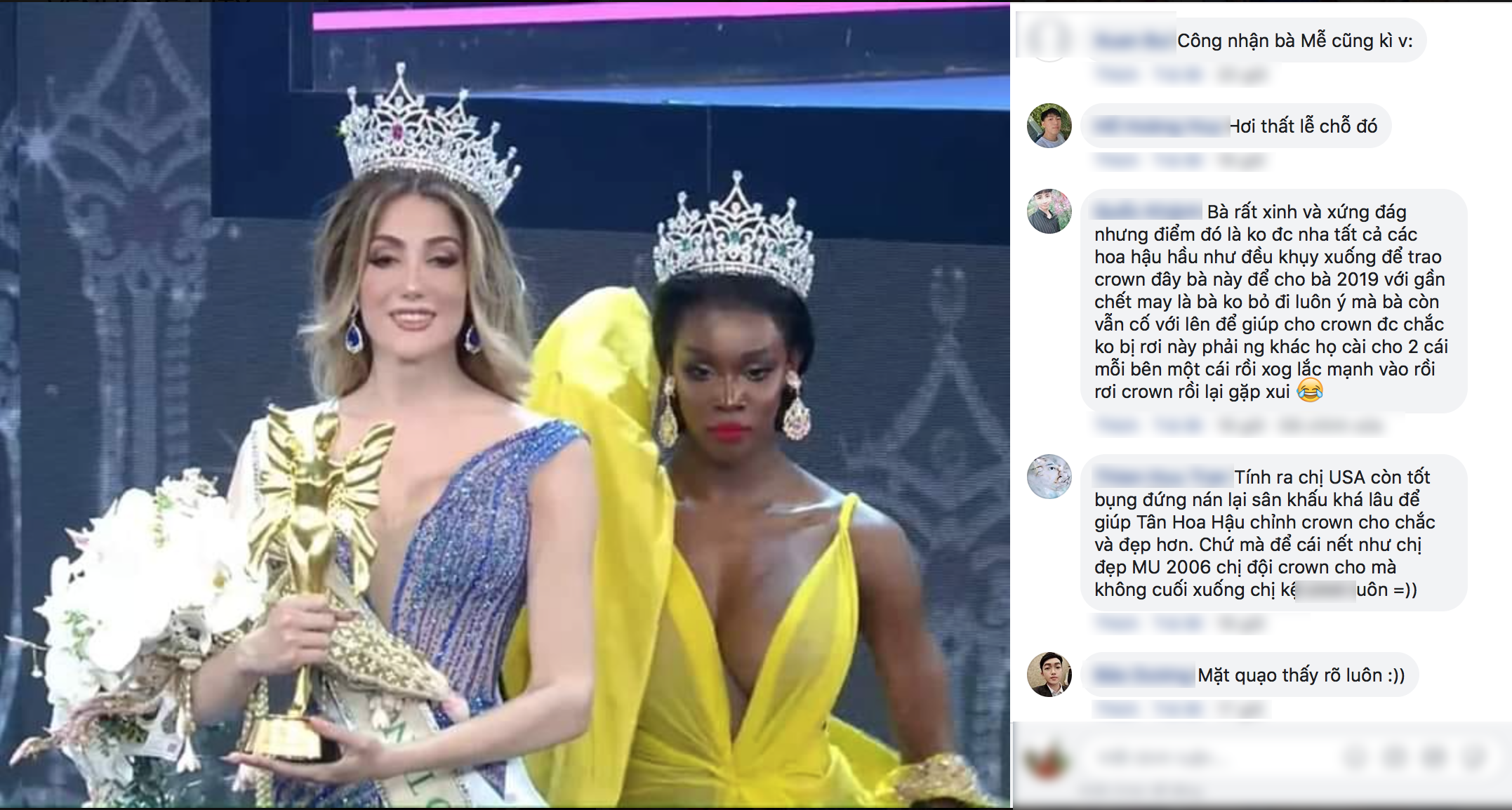 Bên cạnh khoảnh khắc “gây thương nhớ” của 2 thí sinh gốc Việt, fan sắc đẹp khá bức xúc với động thái không thiện chí của tân hoa hậu người Mexico khi cô nàng không chịu khom người để nhận vương miện khiến cựu hoa hậu người Mỹ phải chật vật trong khoảnh khắc chuyển giao đầy ý nghĩa.