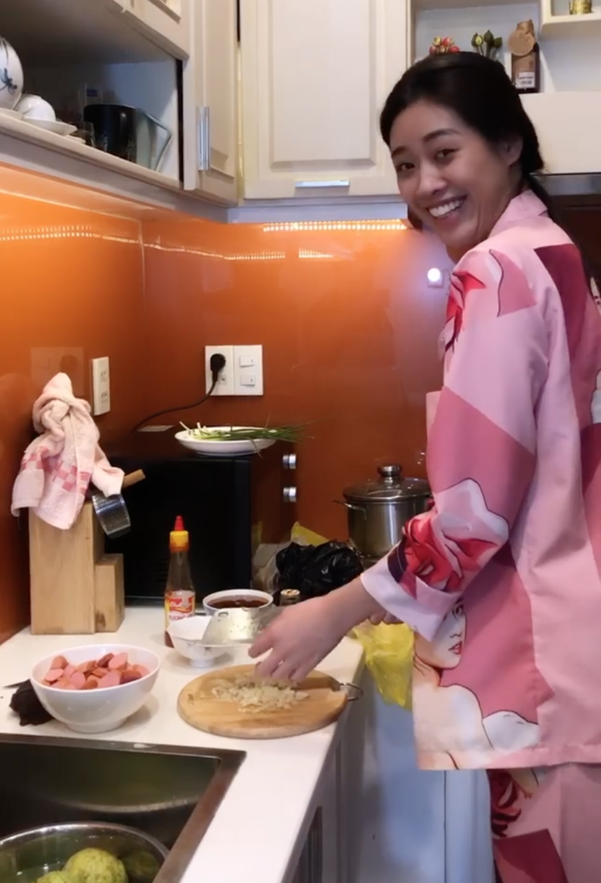 Hoa hậu Khánh Vân siêng năng vào bếp nấu ăn trong thời điểm nghỉ ngơi tránh dịch.