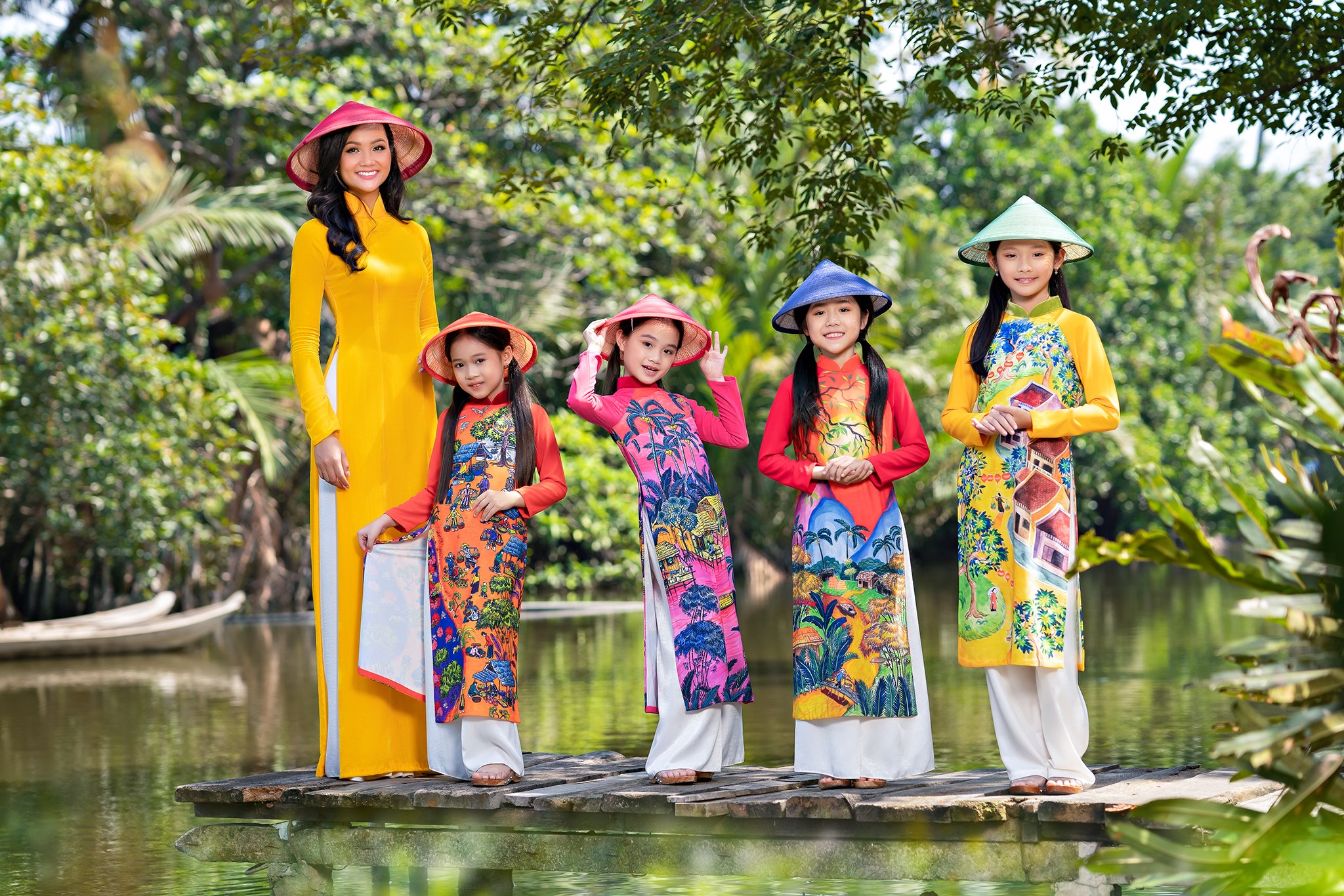 H'Hen Niê và dàn người mẫu nhí là đại diện của những thế hệ trẻ tiếp nối, nâng niu và trân trọng tinh hoa của tà áo dài truyền thống.Những tà áo dài thiếu nhi được lấy ý tưởng từ những bức hoạ đồng quê ngày xuân với những mái lá nhà tranh , những chợ quê nhộn nhịp, những ánh trăng được vẽ tay sau đó in lên vải lụa.