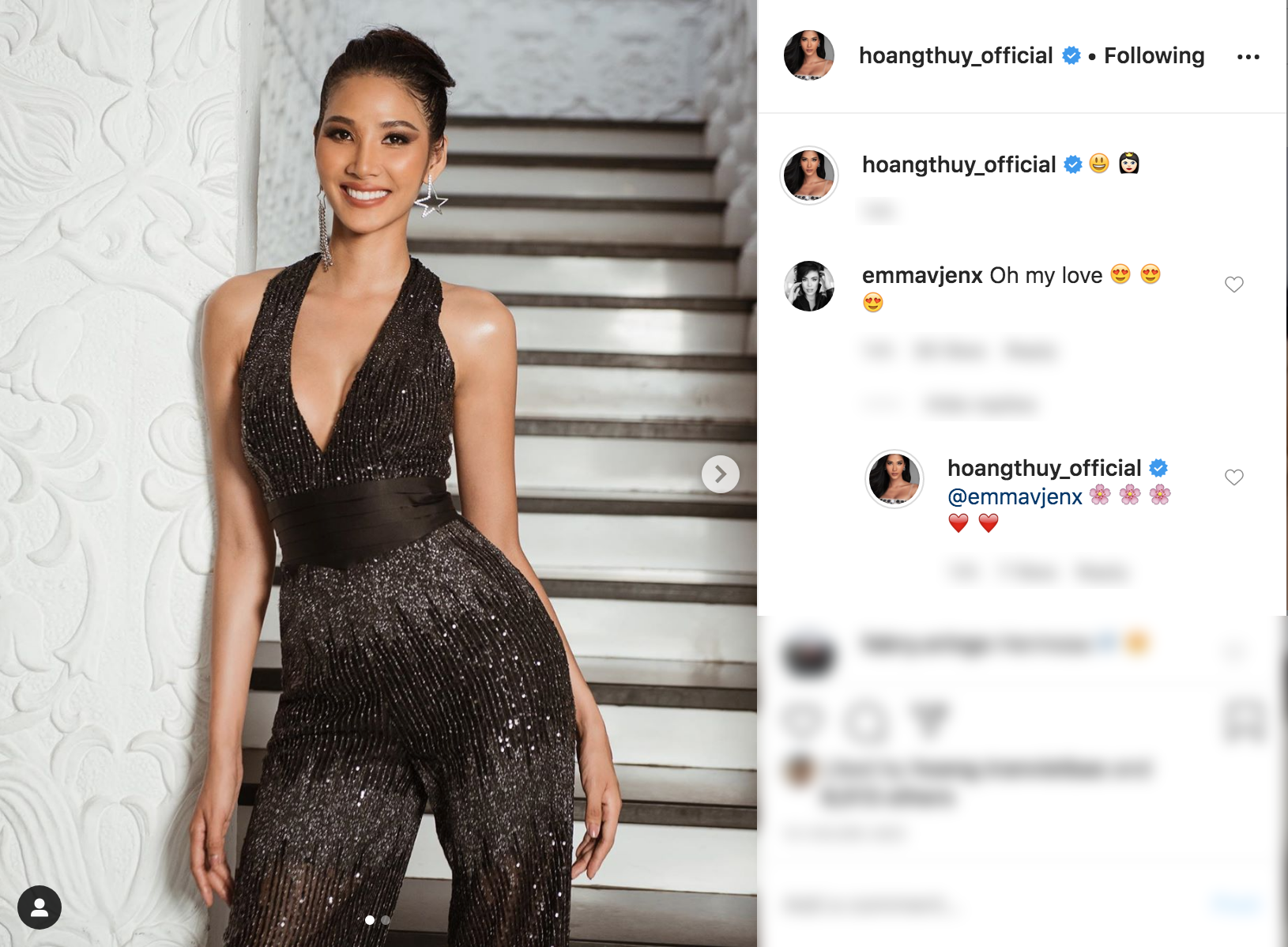 Chia sẻ bộ trang phục jumpsuit đẹp lấp lánh chưa có dịp diện tại cuộc thi Miss Universe 2019, Hoàng Thùy khiến fan tiếc hùi hụi vì vẻ ngoài kiêu sa và sang trọng. Sau khi hình ảnh được đăng tải, hoa hậu Anh - bạn cùng phòng của á hậu bất ngờ thả tim “tỏ tình”.