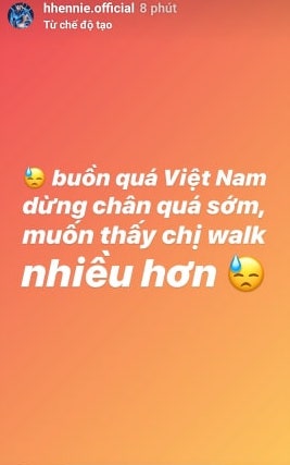 Là người chị em thân thiết và đồng hành cùng Hoàng Thùy, hơn ai hết H'Hen Niê là người hiểu rõ khả năng của đại diện Việt Nam tại Miss Universe 2019 có thể tiến xa hơn vị trí Top 20. Ngay lập tức, H'Hen Niê chia sẻ: “Buồn quá Việt Nam ơi! Dừng chân quá sớm, muốn được thấy chị walk nhiều hơn!”.