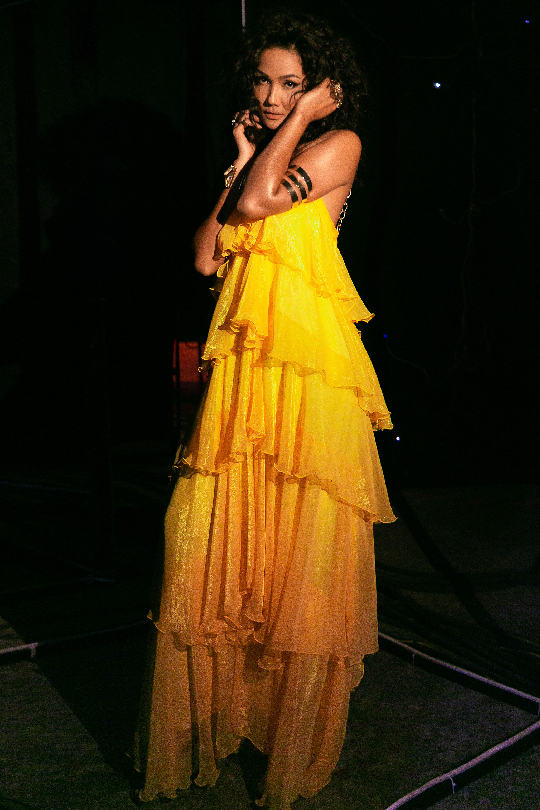 Bộ đầm được thiết kế với chất liệu mỏng, nhẹ, cùng kiểu dáng xếp tầng, buông xõa xuống. Sở hữu vóc dáng nóng bỏng nhưng H’Hen Niê đã “giấu dáng” khi diện bộ đầm này, vì cô muốn tập trung vào sự thoải mái khi di chuyển, thay vì khoe hình thể. Bên cạnh đó, trang phục rất phù hợp với kiểu tóc xoăn hoang dã, mang phong cách tropical đầy ấn tượng.