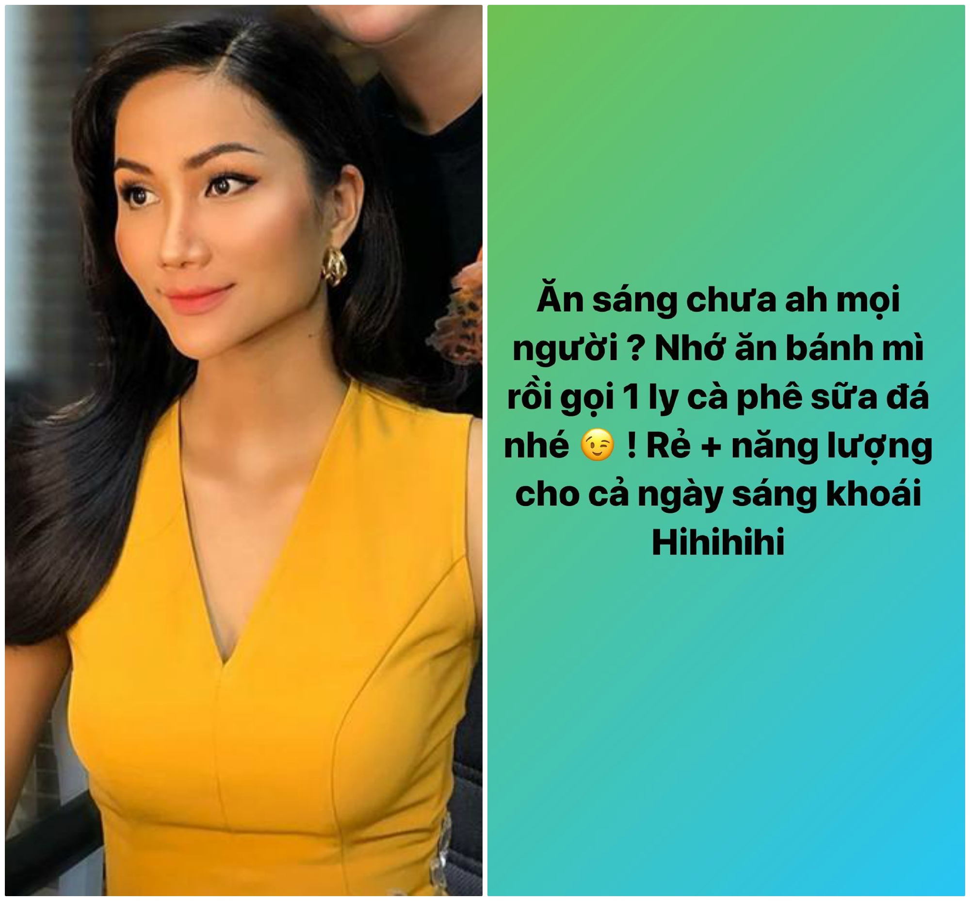 Mới đây, người hâm mộ cảm thấy vô cùng tò mò khi đương kim Hoa hậu Hoàn vũ Việt Nam - H'Hen Niê đăng tải dòng trạng thái khuyên fan dùng bữa sáng với bánh mì và cà phê. Sau chia sẻ này fan sắc đẹp nghi vấn H'Hen Niê đang “úp mở” việc á hậu Hoàng Thùy đã chọn “Cafe phin sữa đá” là National Costume mang đến Miss Universe 2019.