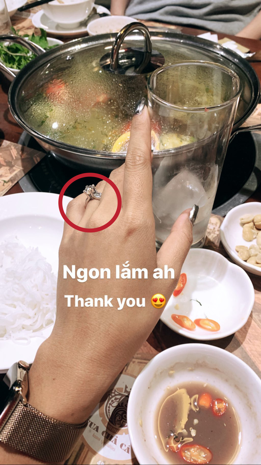 Cụ thể, trong hình ảnh đăng tải khoảnh khắc nâng ly trên bàn tiệc tại Instagram, người hâm mộ chú ý đến chi tiết nhẫn kim cương mà người đẹp đang đeo, vị trí ngay ngón áp út. Điều này dấy lên nghi vấn Hoa hậu Hoàn vũ Việt Nam 2017 đã được cầu hôn và chuẩn bị sắp lên xe hoa.