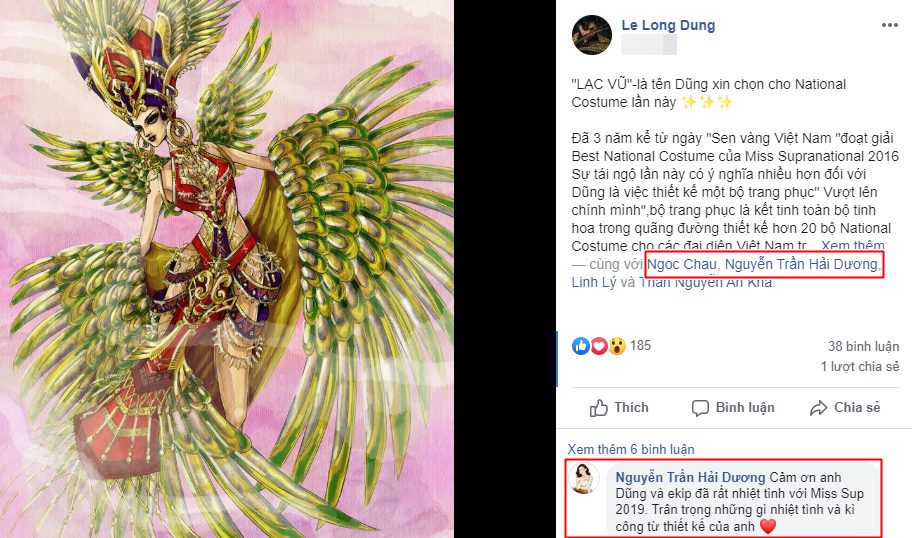 Dòng trạng thái chia sẻ trên trang cá nhân của NTK Lê Long Dũng vừa hé lộ cho khán giả trang phục dân tộc của Ngọc Châu tại Miss Supranational 2019 với tên gọi Lạc Vũ. Ngay lập tức, khán giả dành vô số lời khen ngợi cho sự đầu tư chu đáo và sự sáng tạo cho lần xuất ngoại lần này của Ngọc Châu cùng toàn bộ ê-kíp.
