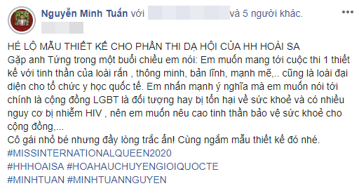 Theo chia sẻ của NTK Nguyễn Minh Tuấn, trước khi đến với đấu trường quốc tế Hoài Sa đã ngỏ ý muốn mang đến cuộc thi một tinh thần với trái tim đầy lòng trắc ẩn. “Em muốn mang tới cuộc thi một thiết kế với tinh thần của một loài rắn, thông minh, bản lĩnh, mạnh mẽ. Cũng là loài đại diện cho tổ chức y học quốc tế”.